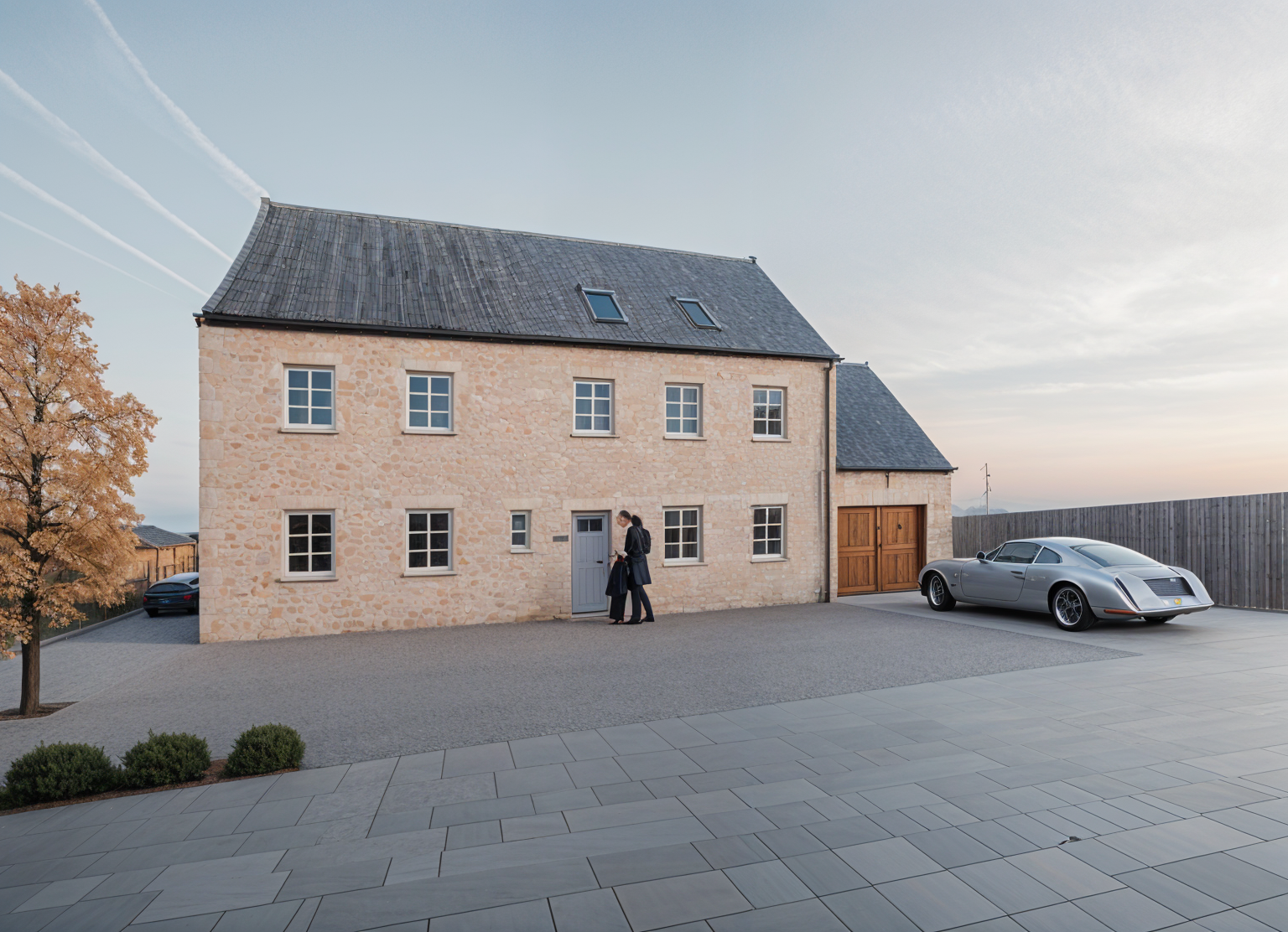 modern house exterior with a minimalist design dark beige lap siding dark greyish green board and batten siding on the main structure a small section at the entry with vertical wood accents charcoal gray asphalt shingle roof large windows with clear glass garage doors in sleek black smooth asphalt driveway serene afternoon light with a clear blue sky casting soft shadow landscaping including shrubs around the perimeter and neatly trimmed grass for a polished finish mountains in the background
