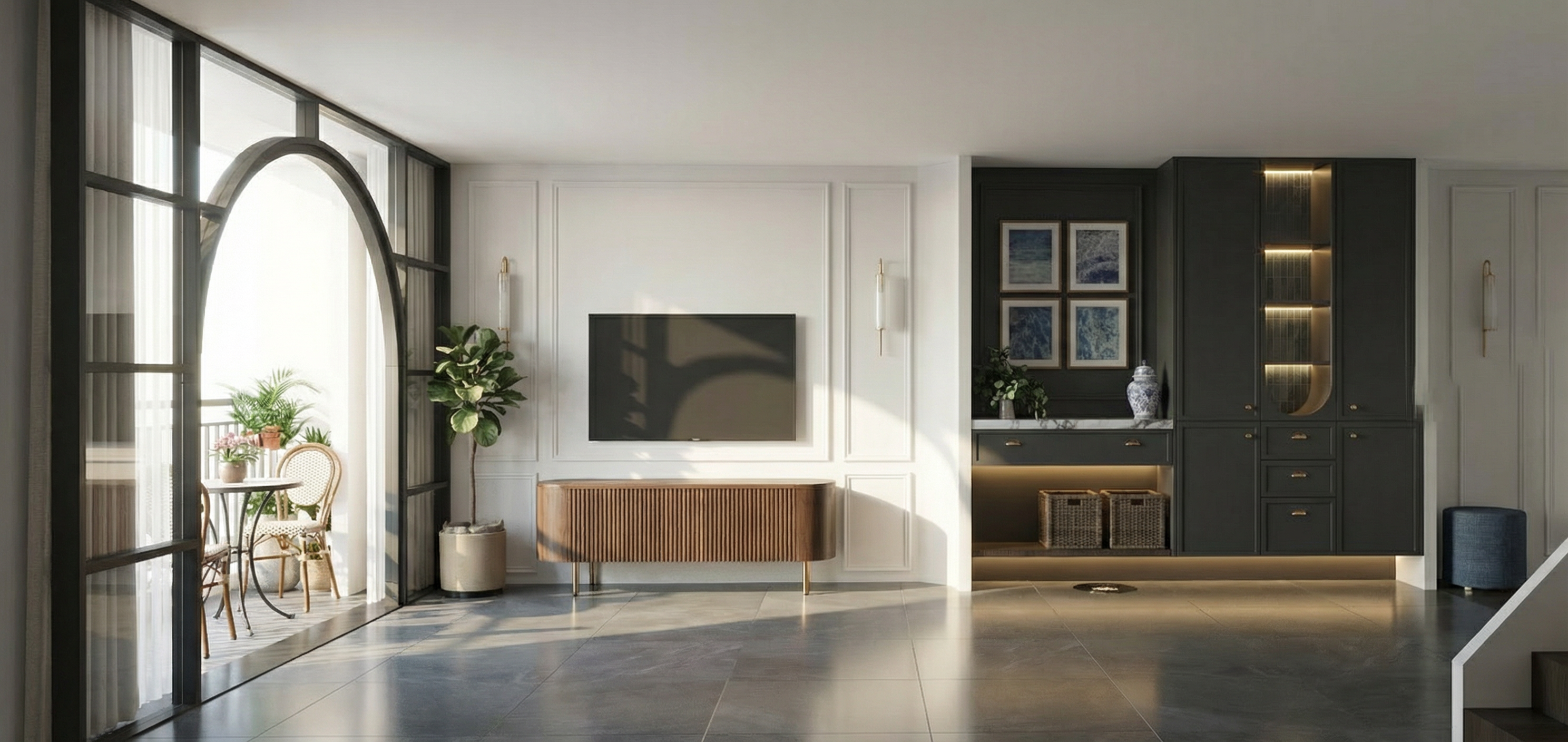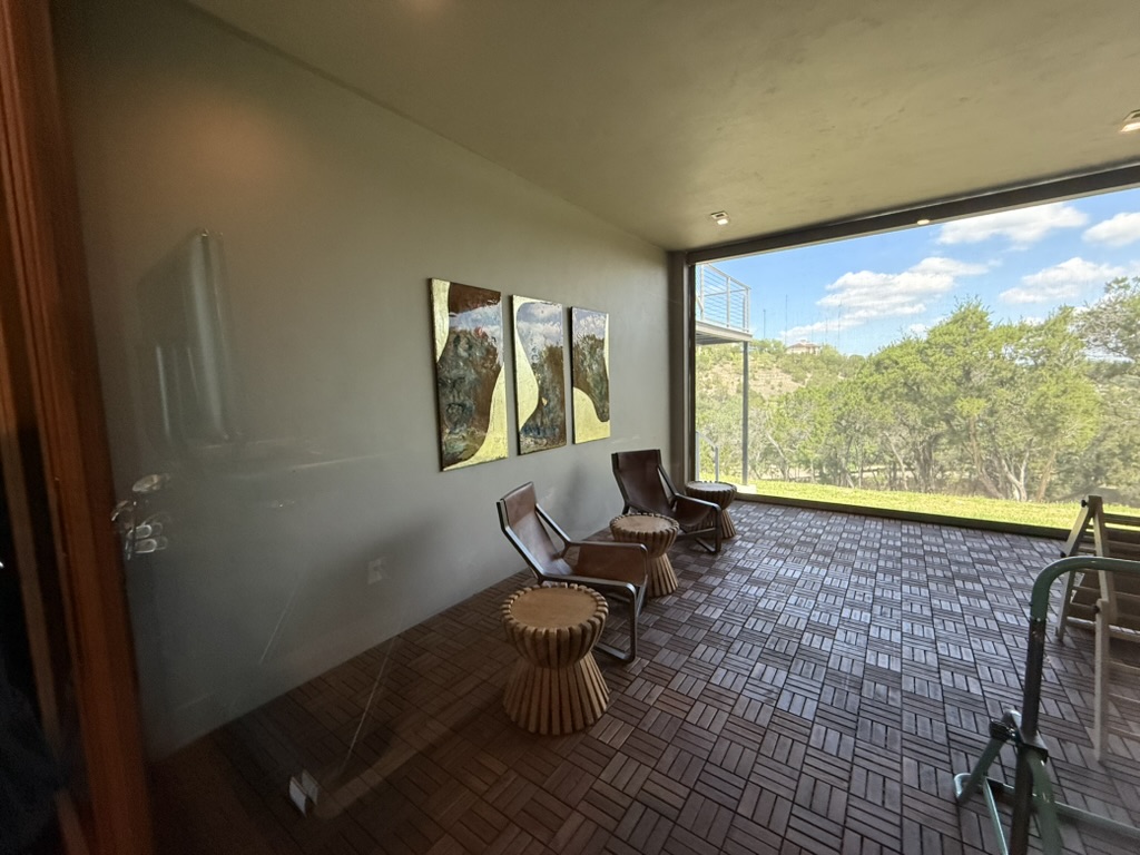 use the artwork reference provided on the white wall change the flooring to a charcoal black tile like in the reference photo