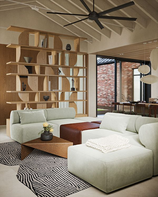 insert just the shelf system as a space divider in a simple plywood metals and concrete restaurant setting fill in the shelving with food retail products this shelf needs to feel more modern with colors of dark blues and hot pinks