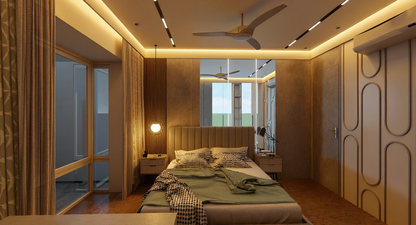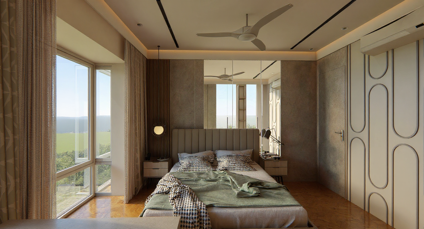 keep base image same add some warm daylight add ceiling lights with whiter shade table side lamp keep on keep white marble flooring as base image keep greyish look in the room furniture