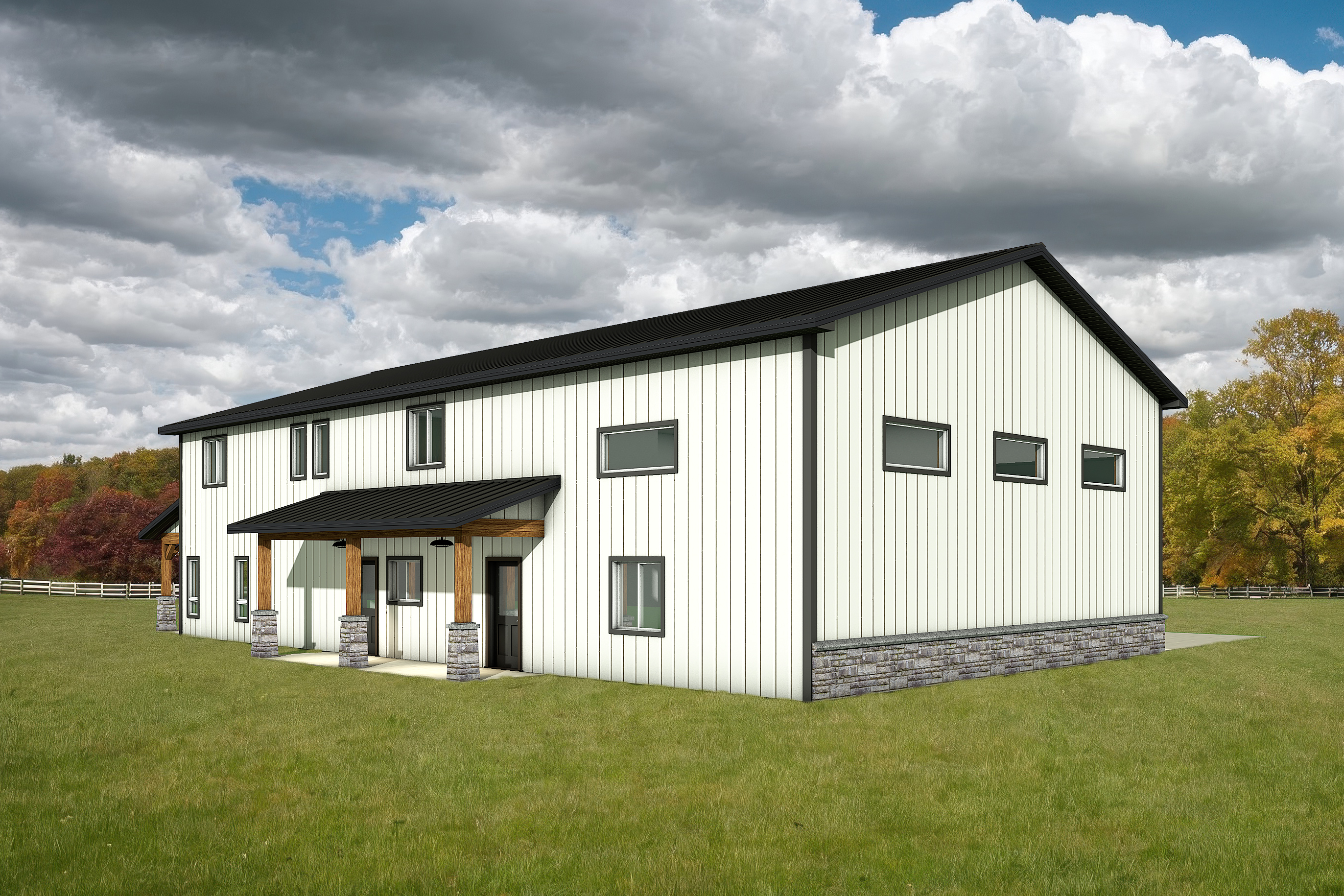 a modern house retain the exact structure colors and window arrangement rooflines siding foundation height railings wood stain colors and proportions exactly as shown in the reference image integrate into the terrain there are very few trees of mixed hardwoods that are mostly on in the distance of the image add cooler diffused afternoon sunlight subtle dappled highlights across the siding and grass create ultra realistic lighting crisp shadows detailed textures in the siding and glass reflections and an overcast sky show only a few lights visible inside render in hyper realistic architectural visualization quality 8k resolution add a driveway tying into the concrete garage door apron make it the summer season add realistic landscape keep the white farm fence in the background