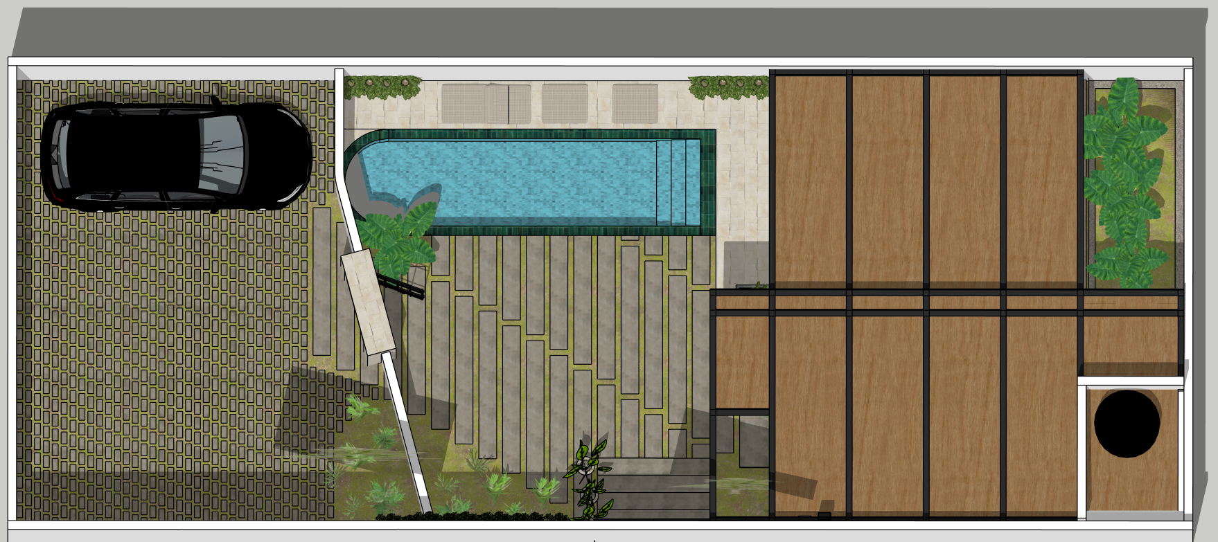 upper floor view of a patio terrace with a pool and a wooden roofed cabin on the right keep the design of the floor on the garage and patio concrete paver flooring and landscaping