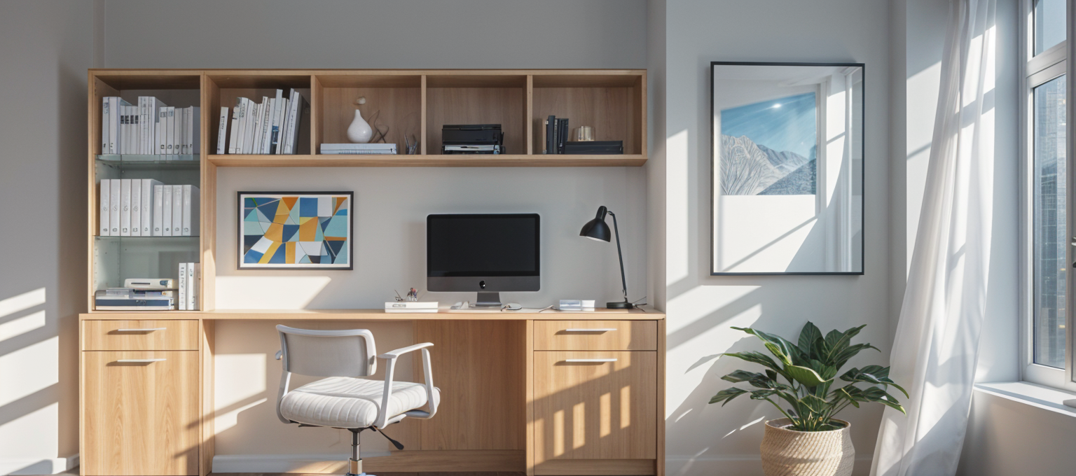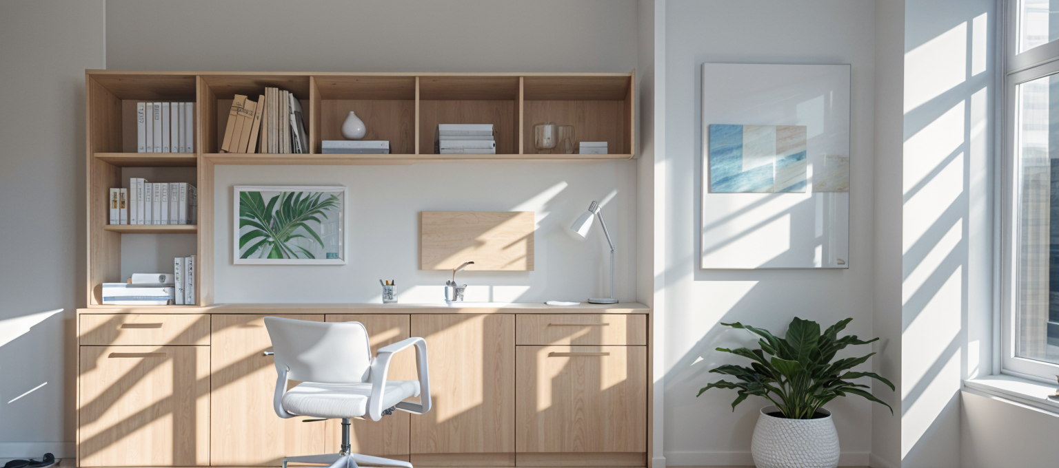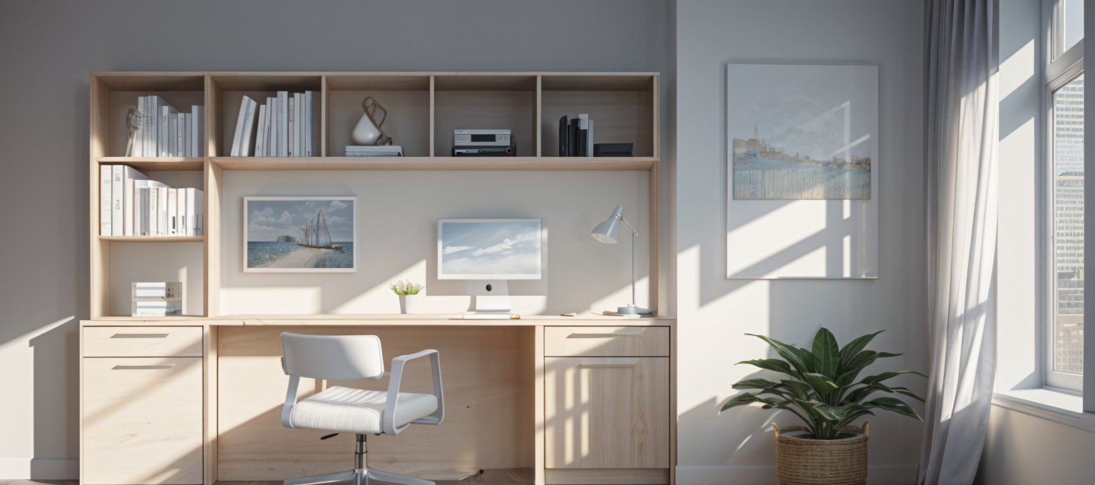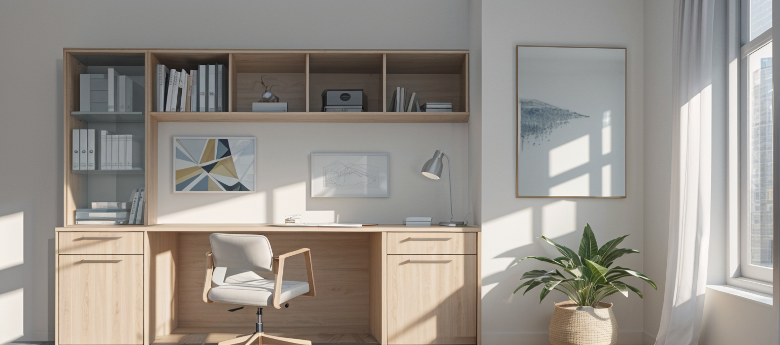 art deco interior shot compact home office nook in a modern townhouse neutral palette floating wood desk laptop setup framed artwork of bc landscapes soft led lighting comfortable and functional design urban canadian style architecture