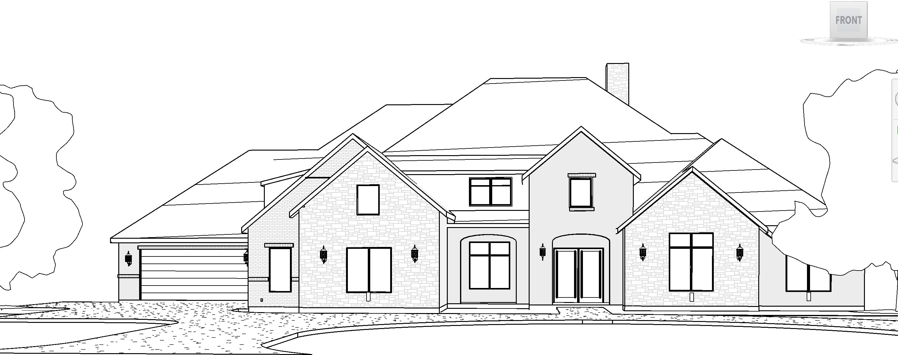 creamy white austin stone and stucco with black roof and windows big trees curved drive evening time with soft light in the windows close the curtains on left side