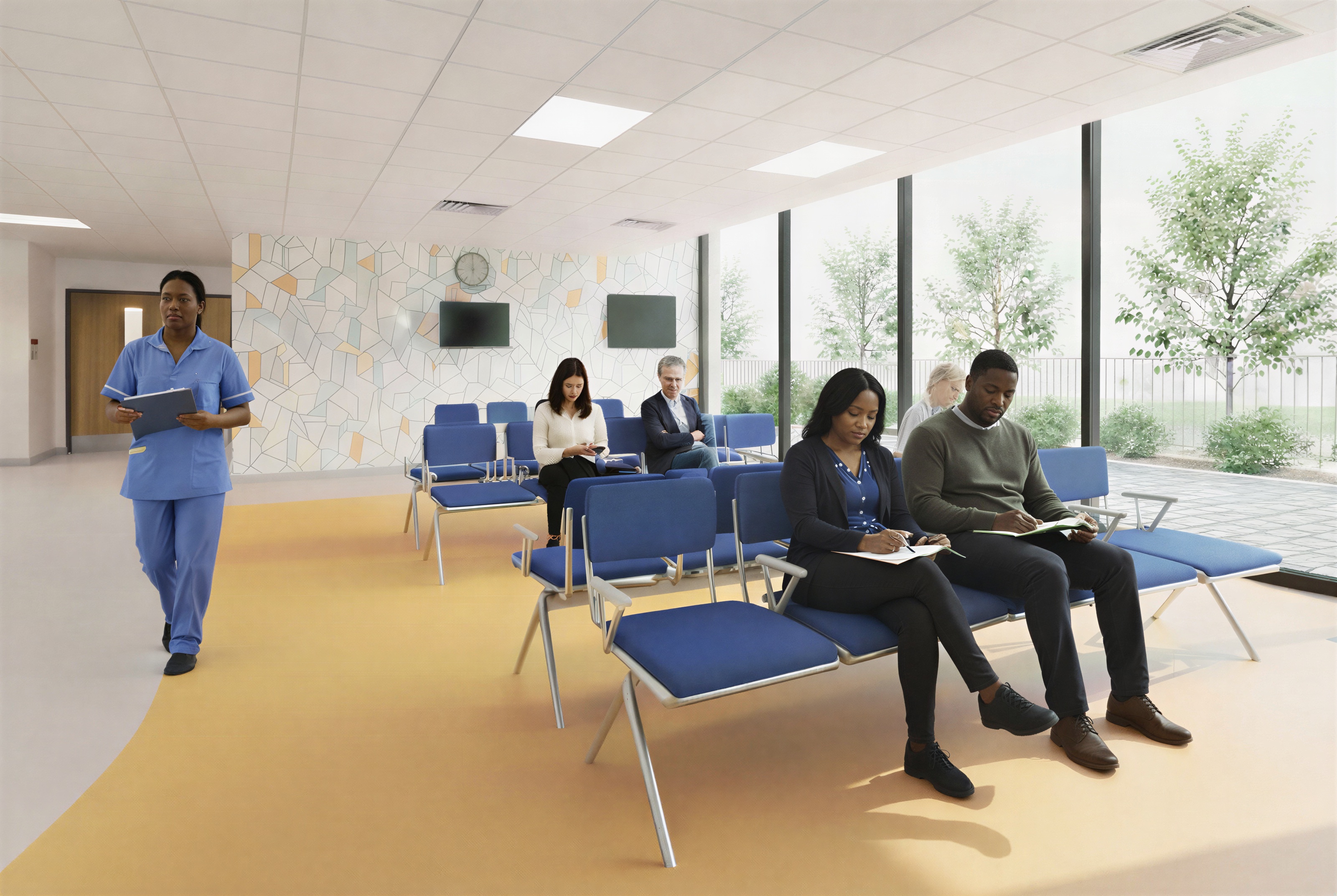 remove the white man seating next to the woman at the back of the waiting area keep everything else the same with no changes