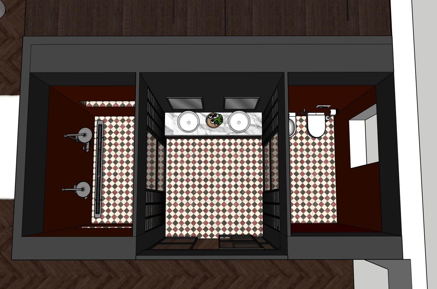 the master bathroom includes double floating vanity with stone countertop two separate walk in showers with frameless glass wc and bidet in a semi private niche