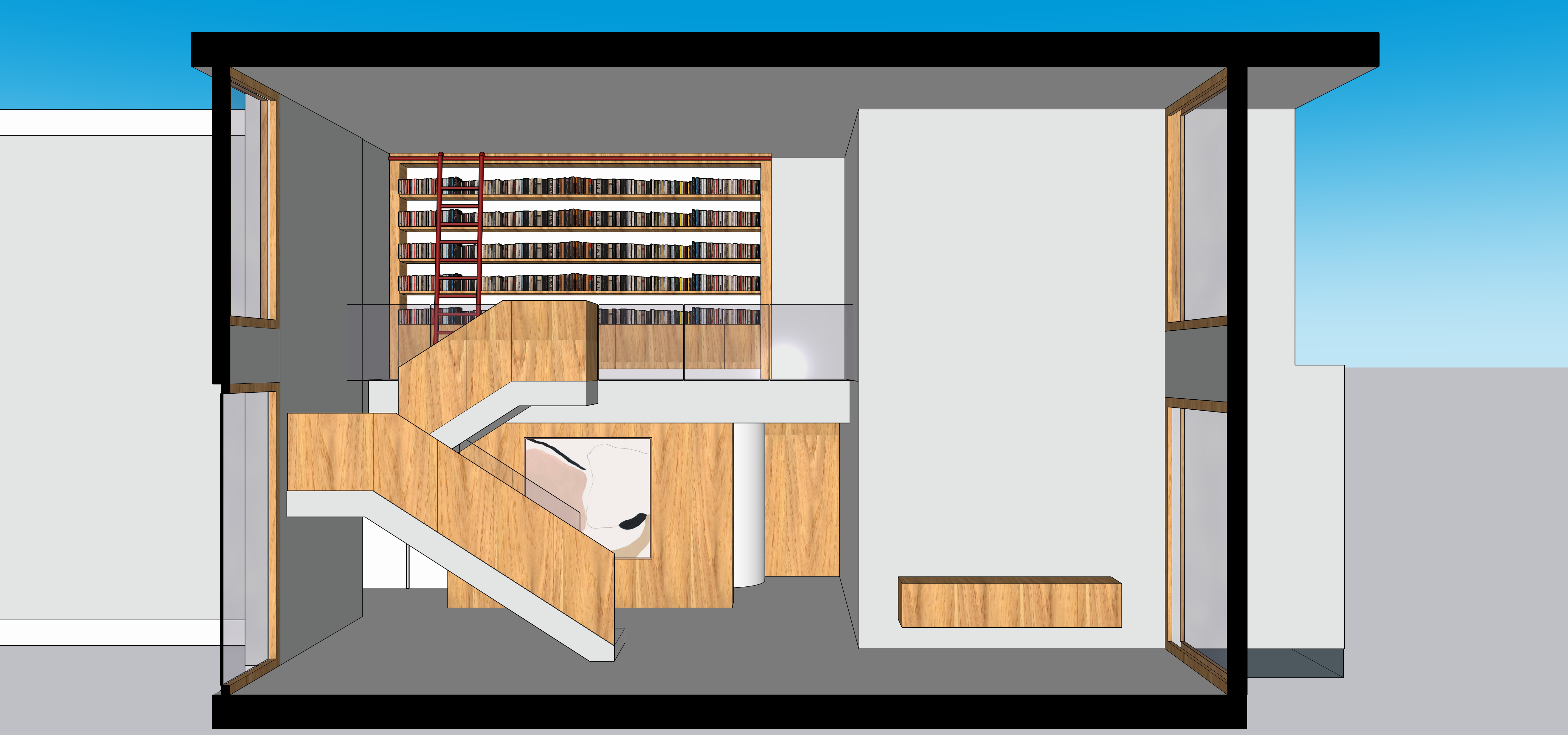 render this view as a photorrealistic architectural render floors should be in a large light beige natural stone material stairs railings should be in wood