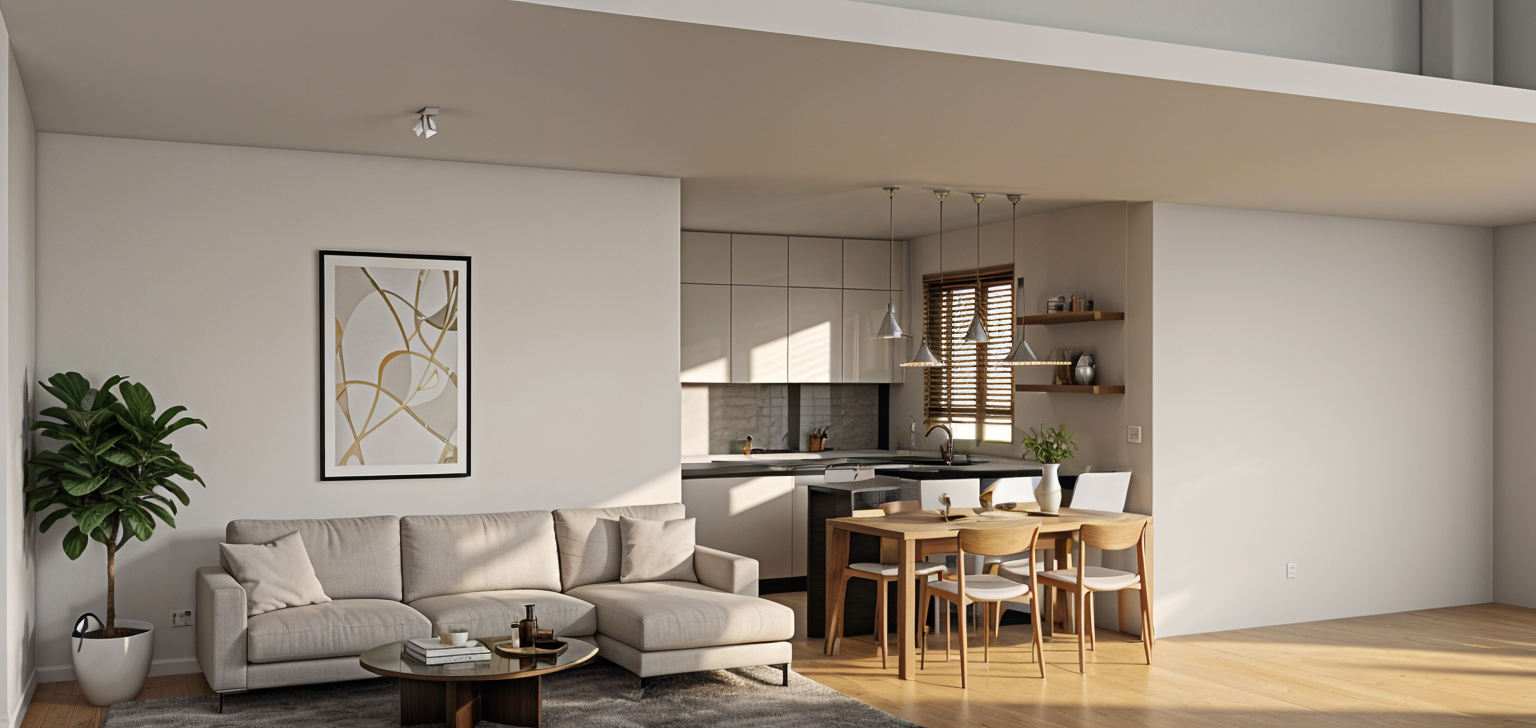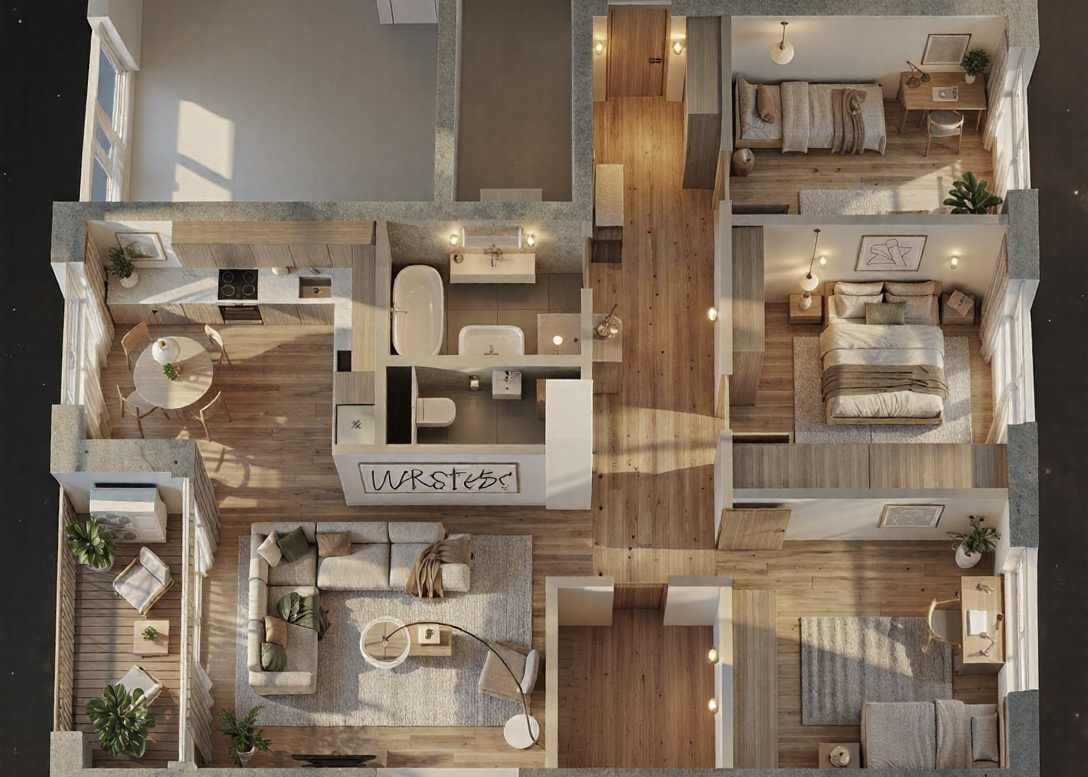 generate an alternative version of the scene using darker tones for the furniture and flooring increase contrast between elements to create a more defined and visually rich composition while maintaining a balanced and cohesive look avoid overly bold or harsh contrasts keep the palette refined subtle and aesthetically pleasing make it in daylight conditions
