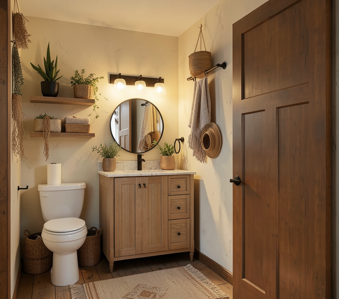 rustic modern boho bathroom beige tile floors with some sage green accents and granite countertops