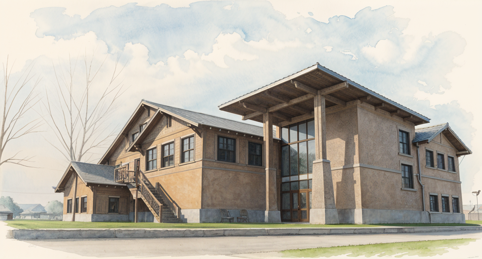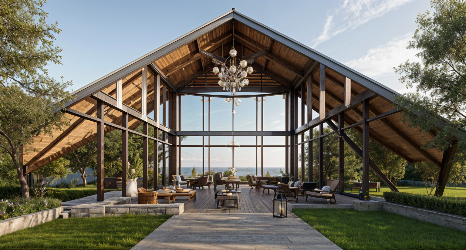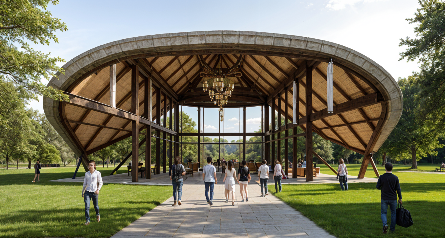 create a realistic architectural render of the building shown in the reference image the design proportions and materials from the reference must remain exact with realistic textures applied include people that fit the setting e g professionals students or visitors depending on the building type scaled accurately and dressed appropriately ensure shadows reflections and lighting create a natural well balanced daytime scene that highlights the architecture add people having a dinner or talking eating
