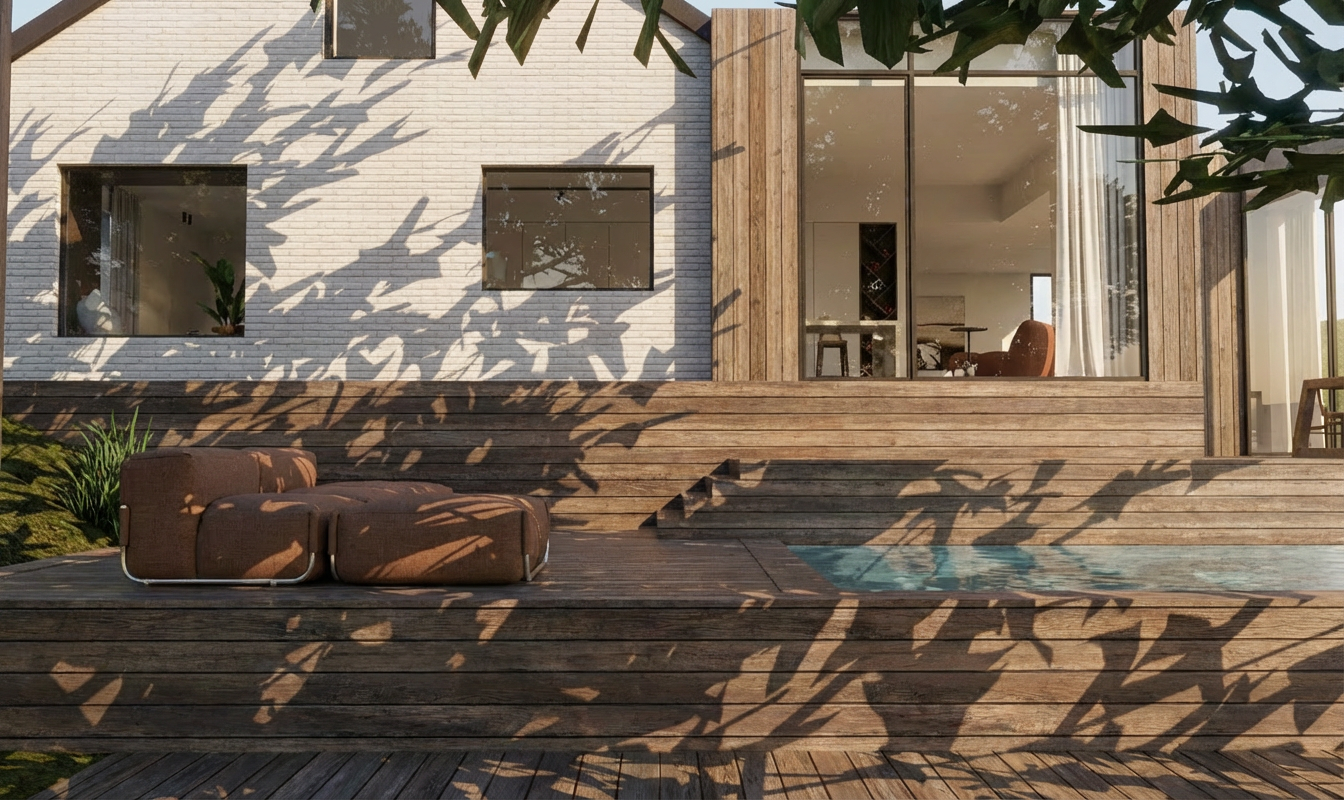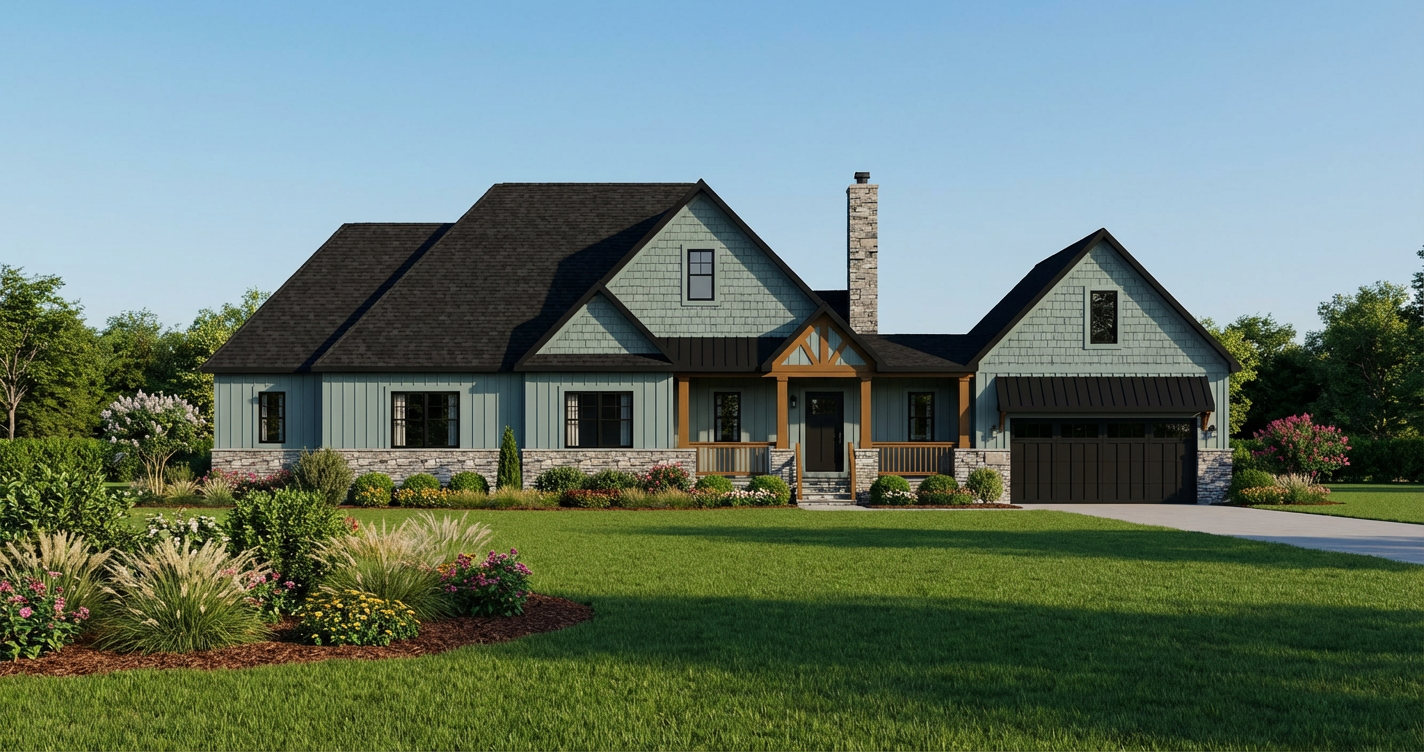 this is a model of a house add few trees in background for context add vegetation with some floral ones