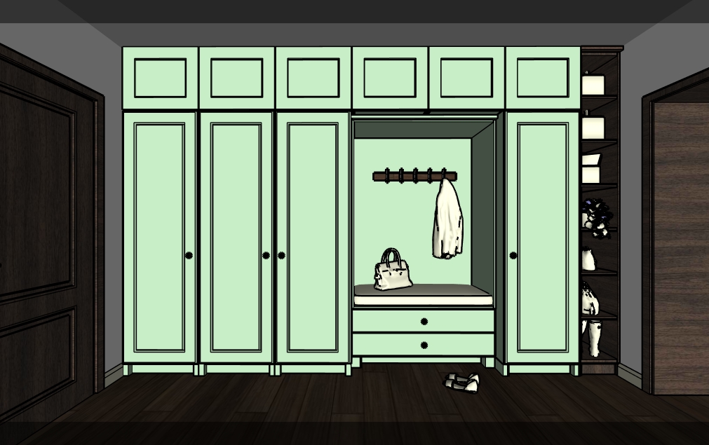 photorealistic interior render of a home entrance corridor designed in modern rustic provence style maintain the original layout proportions scale and built in cabinetry exactly as shown in the concept image do not change room dimensions cabinet sizes or spatial relationships color palette light walnut wood flooring warm off white walls and cabinetry deep muted olive green sage green built in wardrobes and storage units with a rich elegant tone not pastel not grayish materials natural wood painted wood with a soft matte finish subtle patina details brushed brass hardware style references european country house soft provence influence cozy yet elegant timeless natural and refined lighting warm natural daylight soft realistic shadows balanced indoor lighting with a true to life residential atmosphere add photorealistic lifestyle accessories such as shoes coats bags and fresh flowers accessories should be natural colorful and realistic enhancing the lived in feel without cluttering the space mood welcoming calm refined slightly rustic yet clean and modern highly realistic textures accurate proportions premium residential interior photography look avoid stylization avoid changing proportions avoid exaggeration