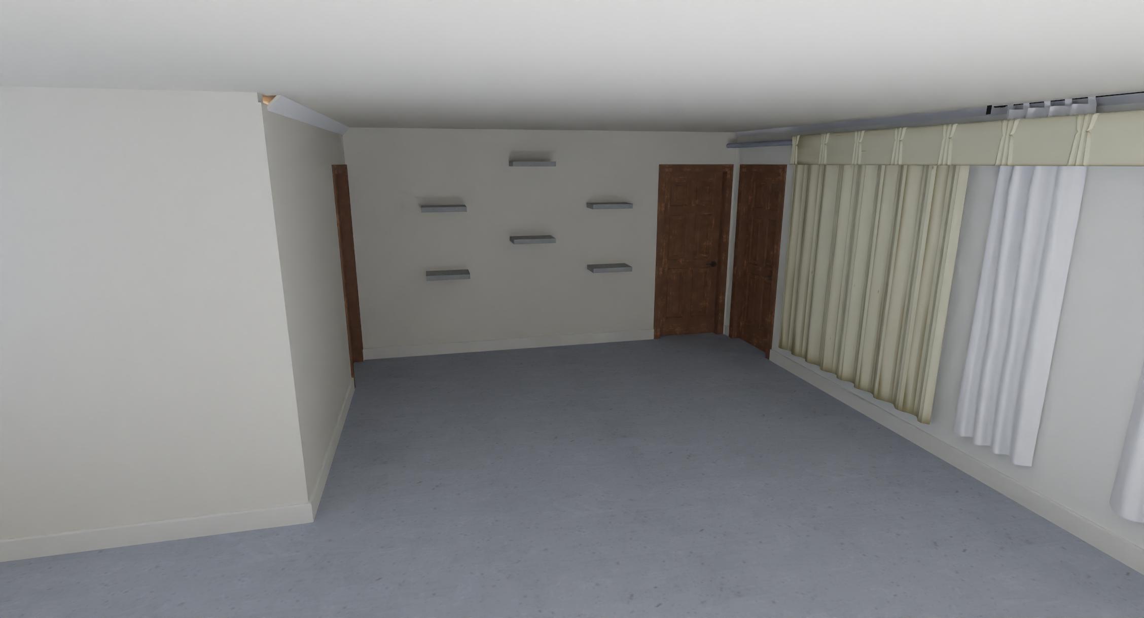 floating shelves with trophies on walls