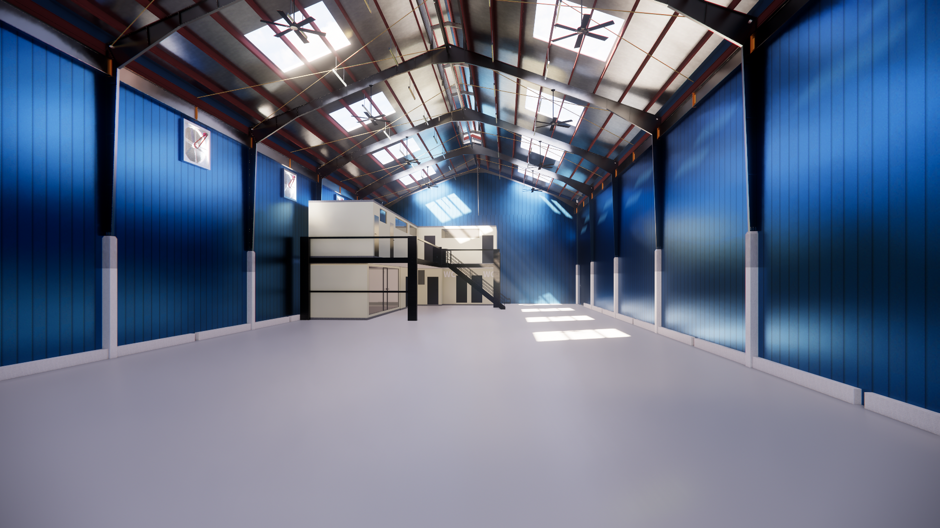 create a stunning digital rendering of an industrial interior with high ceilings and large windows allowing natural light to flood in the walls are a deep metallic blue contrasting with sleek white accents the support beams and trusses are a dark industrial black while the roof has a hint of metallic sheen the atmosphere is bright and modern with clear sunlight casting dynamic shadows on the smooth light gray floor add subtle reflections to enhance the modern architectural design resulting in a clean and organized space