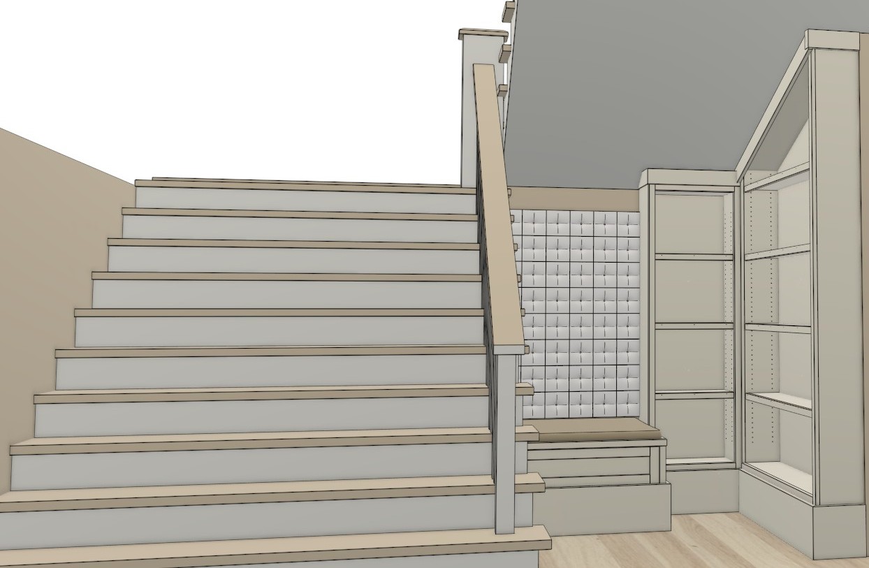 the stair risers are black the stair treads are a dark wood stain the cabinets are painted white