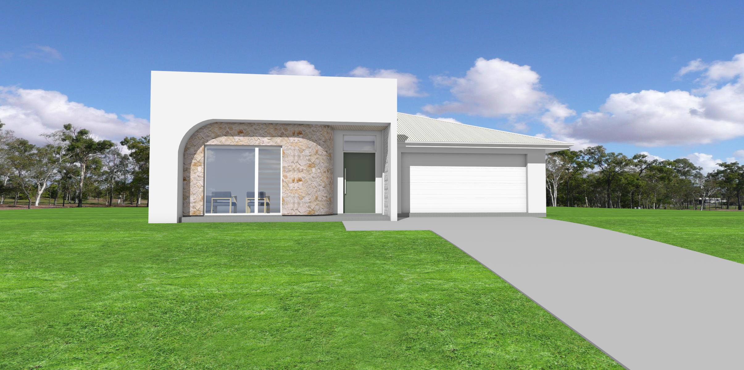 render and stone walls white steel roof reflective glass windows grass lawn with some minimal feature garden beds
