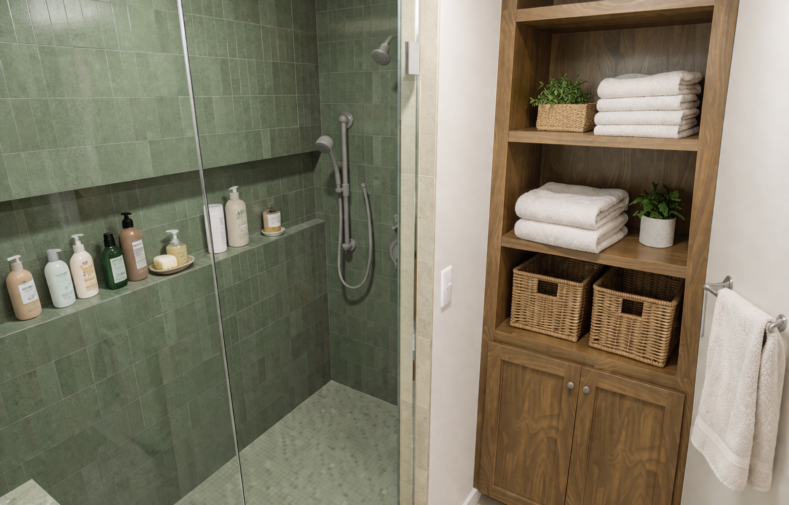 make the cabinet on the right just a base cabinet with floating shelves above the wall should be visible on the sides and back of this area with the floating shelves keep all other elements the same throughout the scene