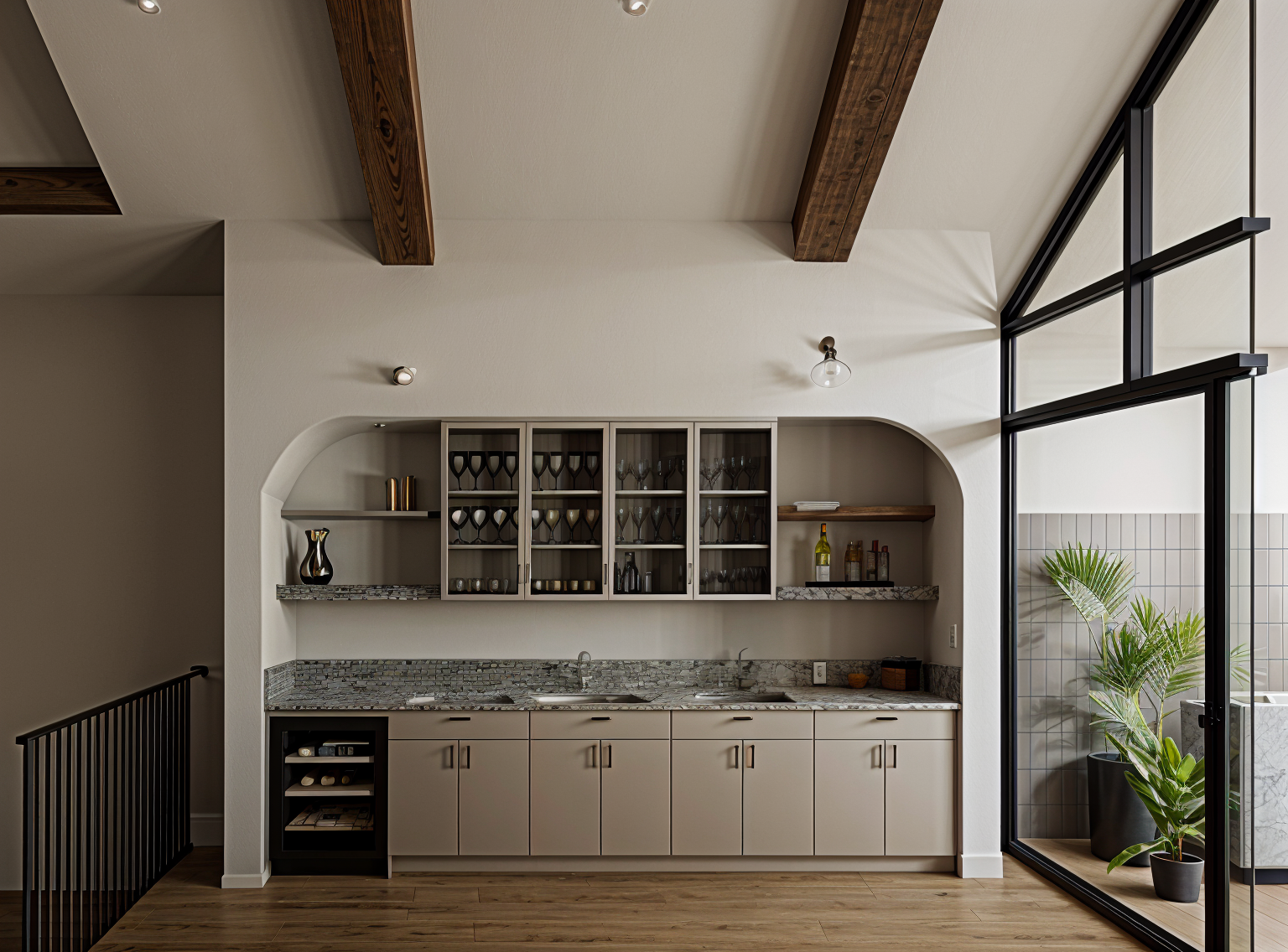 green and greene craftsman style santa cruz mountains redwood trees ferns copper raingutters flagstone fireplace chimney and patio dark brown beams midday people on patio