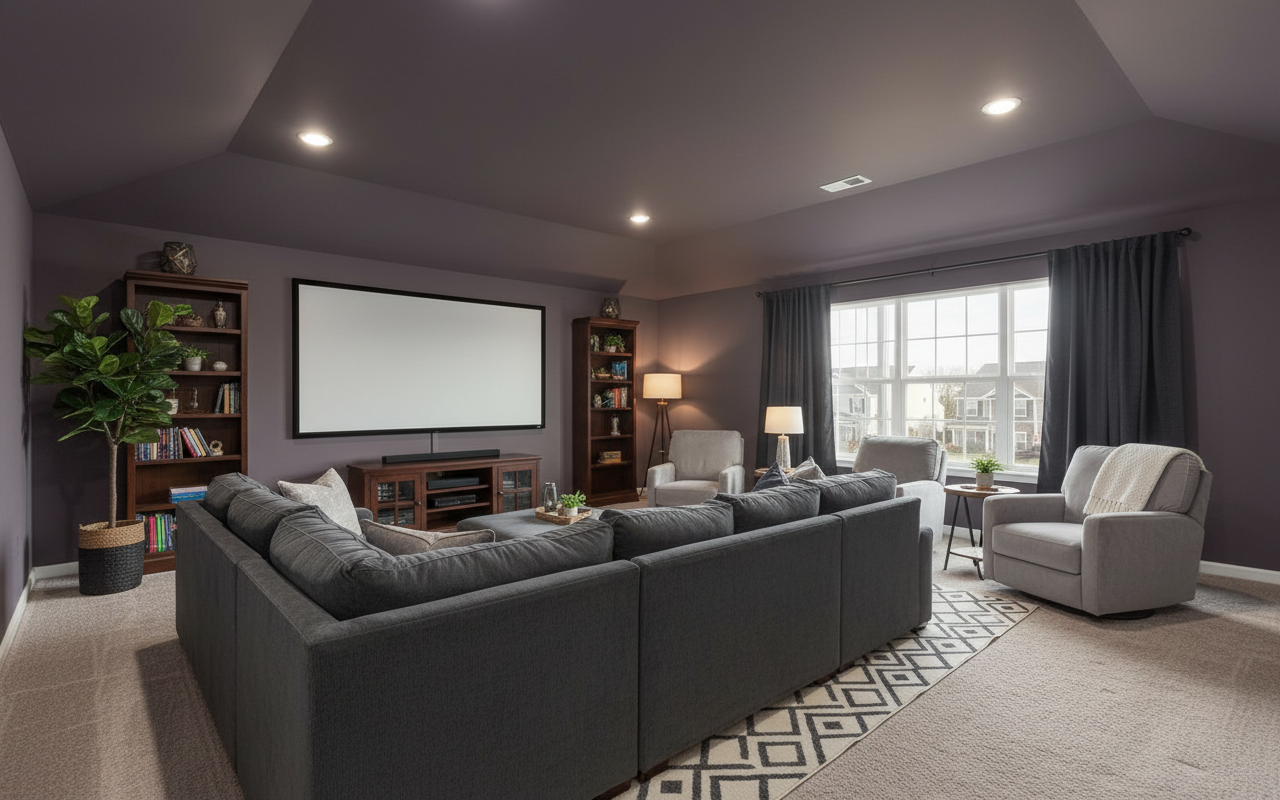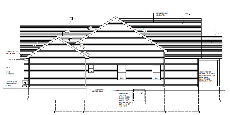 create a right elevation 3d rear rendering with all structural elements drawn untouched keep the angle as is apply the following selections a wolverine blue storm siding and timberline hdz charcoal black shingle roof veneer white windows white trim there are no doors seed 10