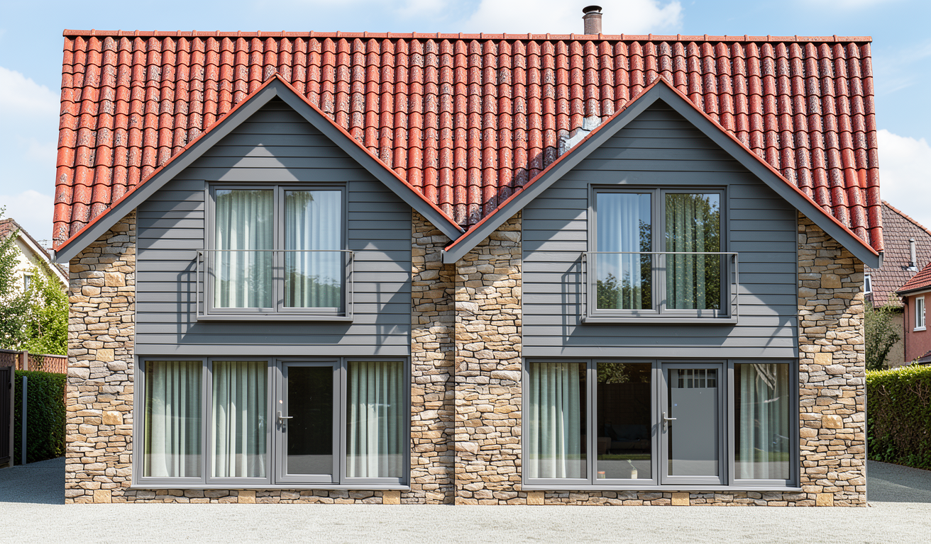 erstelle f r exakt dieses haus eine realistische au enansicht dach anthrazit fassade wei fenster und haust re hellgrau das haus soll in einem dezent modernen garten situiert sein behalte alle ma e und farben des hauses exakt bei