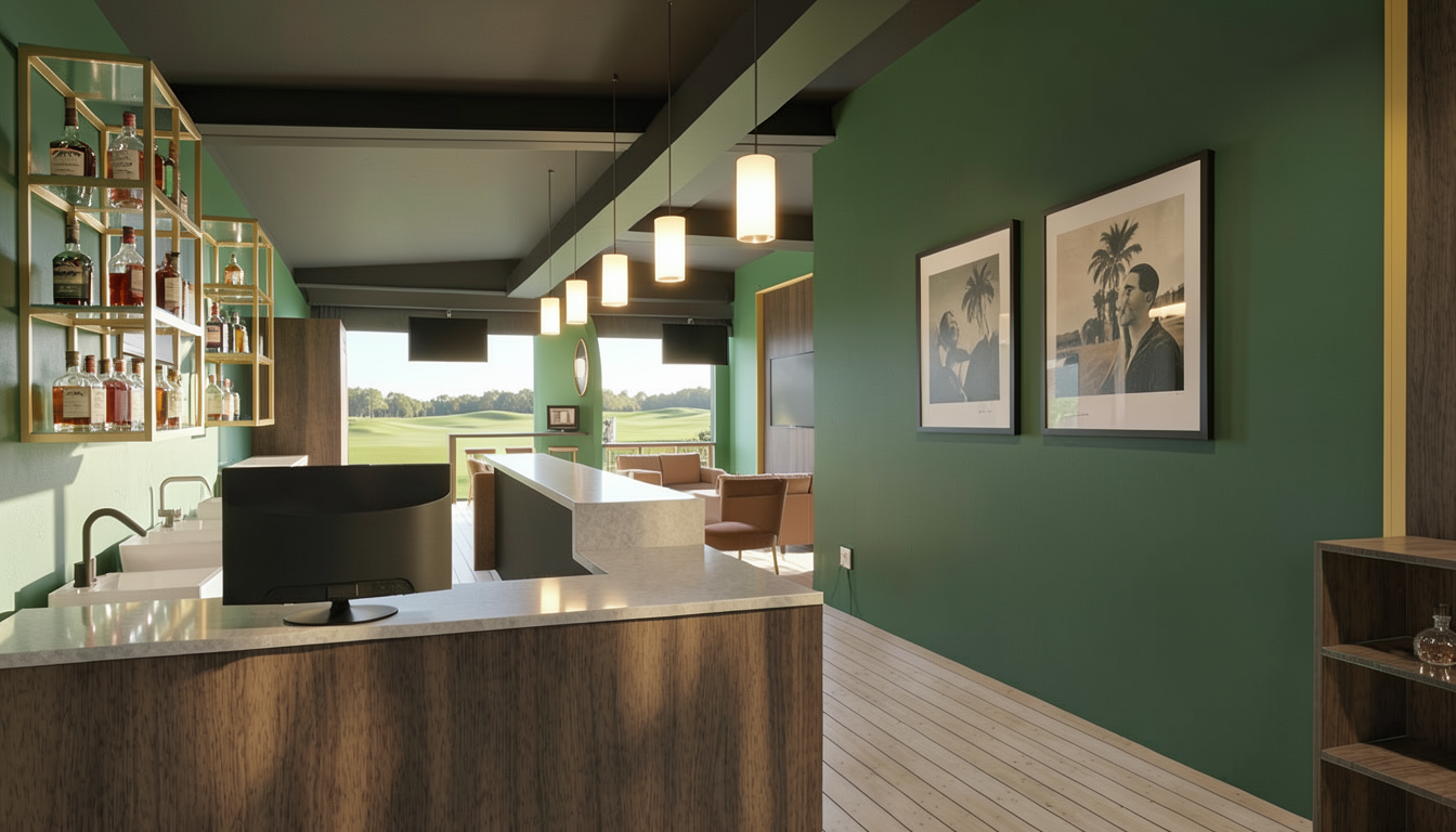 photorealistic interior view of a lounge maintaining colors and geometry liquor bottles on glass shelves with gold metal frames midcentury light fixtures and furniture wall art with views of augusta golf course with views of golf course on large white surfaces in background bar patrons to be people in casual clothing fun vibe in the space with low lighting