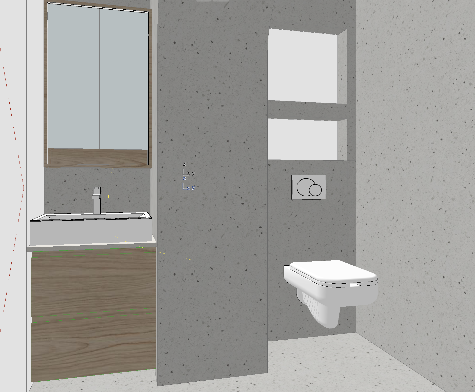 render a modern minimalist bathroom with a sleek contemporary style the walls are smooth concrete gray exuding a cool industrial vibe the floating wooden vanity is a rich walnut brown adding warmth and contrast against the gray the mirror above is frameless with a slight reflective sheen the rectangular basin sink is crisp white as is the wall mounted toilet emphasizing cleanliness and simplicity soft ambient lighting casts a warm glow creating a serene and inviting atmosphere the thick wall dividing vanity area from the toilet niche