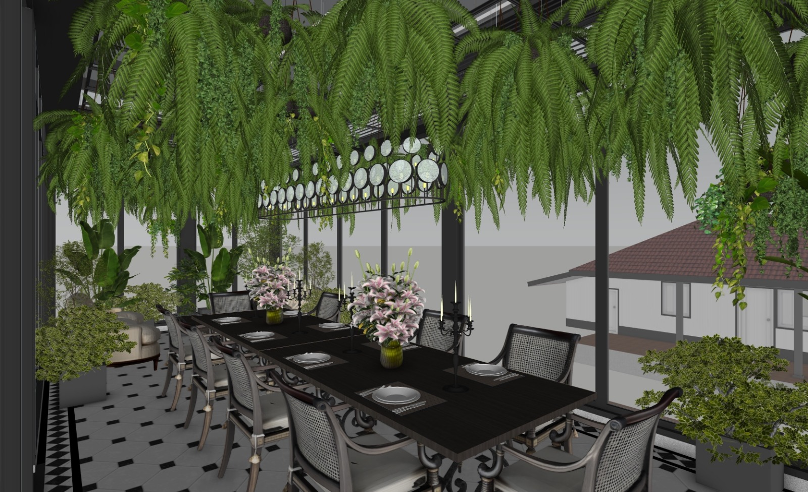 add lawn landscape and trees beyond the house