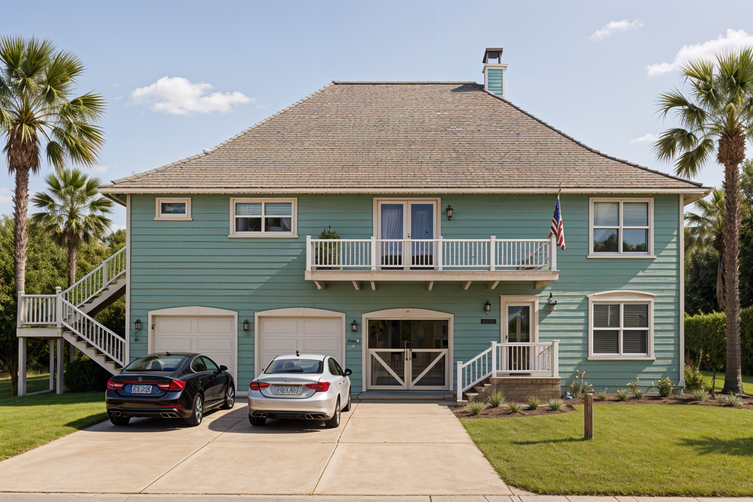 coastal texas native vegetation with tropical flowers driveway only in front of garage doors with cars light coastal blue green house body white trim on doors windows stair and balcony handrails add people flag potted plants on balcony cars on driveway add two people to balcony tropical plants and flowers around house in yard