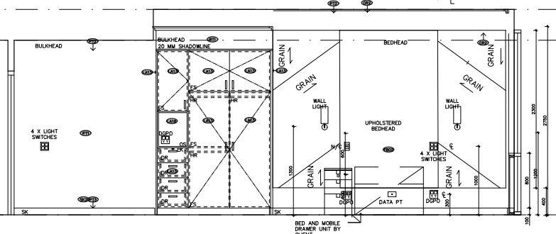 photo realistic bedroom render timber wall panels in diagonal timber grain and upholster bedhead full height wall lights laminate cupboard to side with open shelf in olive green use single bed suitable for aged care