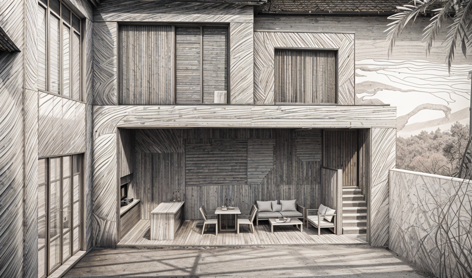rustic architectural masterpiece large bamboo structure with an expansive thatched roof golden brown and beige hues surrounded by lush green foliage the ground is paved with a cobblestone pattern in browns and grays creating a harmonious blend with nature a serene twilight atmosphere soft amber lighting casting warm inviting glows from within overcast sky in muted gray tones enhancing the tranquil earthy ambiance architecture