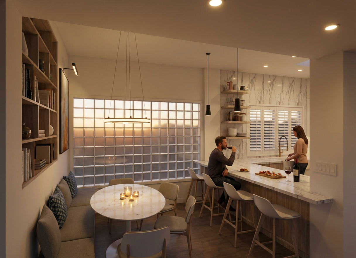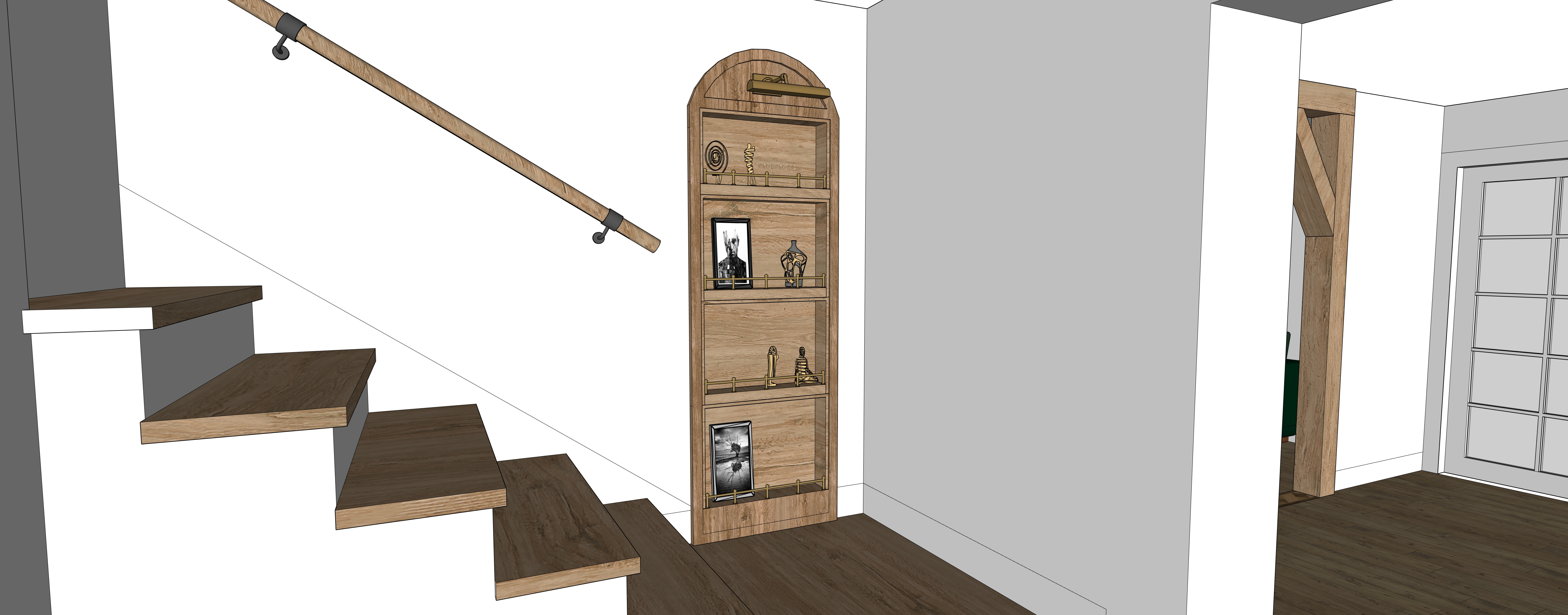 photorealistic traditional stair niche rendering prompt create a highly photorealistic interior rendering of a traditional stair and niche vignette using the provided reference image as a fixed architectural model the layout stair geometry niche proportions shelving wall planes openings and camera perspective must remain exactly as shown do not redesign reposition or reinterpret any architectural elements the space should feel warm serene layered and refined like a professionally photographed custom home detail with subtle age patina and character architecture to preserve exactly stair location tread size and riser proportions wall beneath stair with integrated arched niche built in shelving configuration inside niche all shelf spacing fixed metal gallery rails on shelves picture light centered above niche existing wall mounted stair handrail and brackets opening to adjacent room on right wood structural post and beam at opening door with divided lites in background additions without altering existing geometry add a stair railing on the open side only white painted wood balusters traditional profile evenly spaced stained wood handrail matching stair treads add curated artwork to the blank wall to the right of the stairs do not modify or remove any existing architectural elements materials and realism wood elements critical stair treads niche cabinetry shelving and new handrail in warm natural wood visible grain variation knots and subtle imperfections slight tonal variation between pieces matte to low sheen finish no gloss handcrafted furniture quality appearance niche cabinetry shelving warm wood tone with depth and variation aged brass gallery rails with soft patina subtle shadowing between shelves walls soft warm off white plaster finish subtle tonal variation and light texture not flat drywall metal aged brass picture light and shelf rails muted warm patina not polished lighting critical use soft balanced layered lighting ambient daylight softly filling the space from adjacent openings picture light emits a very gentle diffused glow not bright no hotspot subtle shadowing under shelves and along stair edges even illumination across stair and niche avoid overly dark or overly bright rendering avoid harsh contrast or dramatic spotlighting lighting temperature 3200 3500k warm neutral camera settings eye level 5 ft 28 35mm architectural interior lens maintain exact camera angle and framing high dynamic range ultra high resolution 4k 8k styling minimal controlled niche shelves a few framed pieces muted tones traditional ceramic or stone objects one small antique style decorative item blank wall 1 2 framed artworks with traditional composition keep styling minimal and intentional no clutter rendering style professional architectural interior photography warm slightly moody serene soft contrast with gentle highlights and shadows materials feel tactile aged and dimensional avoid glossy finishes avoid flat lighting avoid builder grade look geometry guardrail critical treat the reference image as a fixed 3d model do not change stair geometry do not alter niche or shelving do not move walls openings or structure do not modify camera angle only allowed additions stair railing and wall artwork enhance materials lighting and realism only