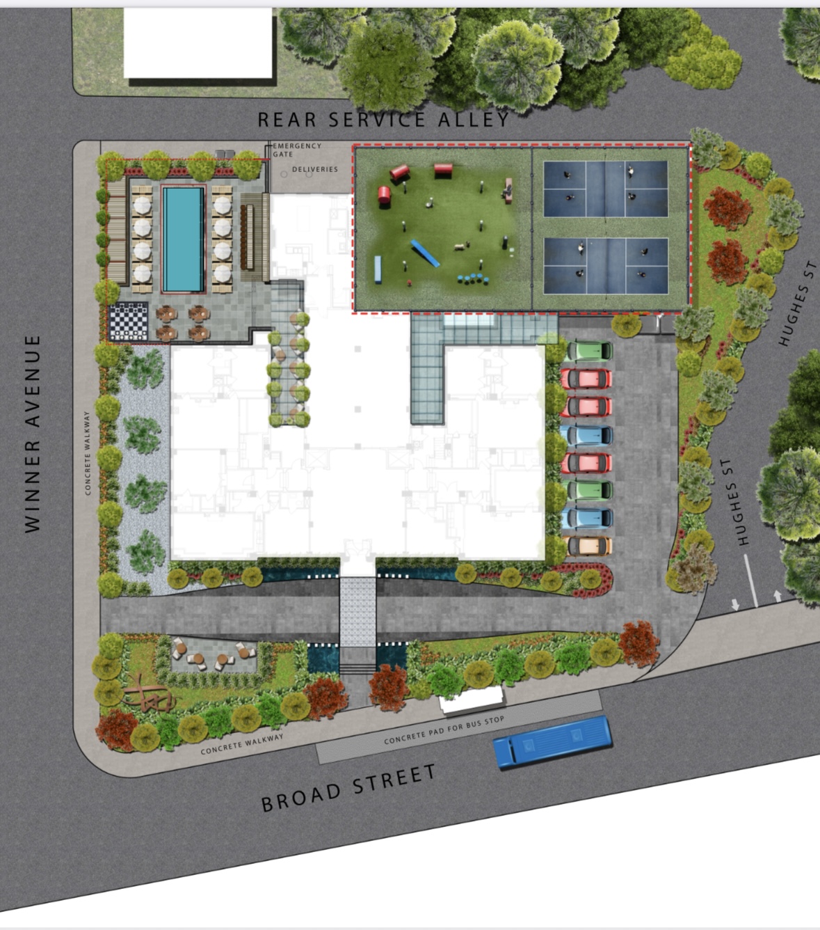 this is a landscape site plan of the broadwin hotel please make it look photorealistic