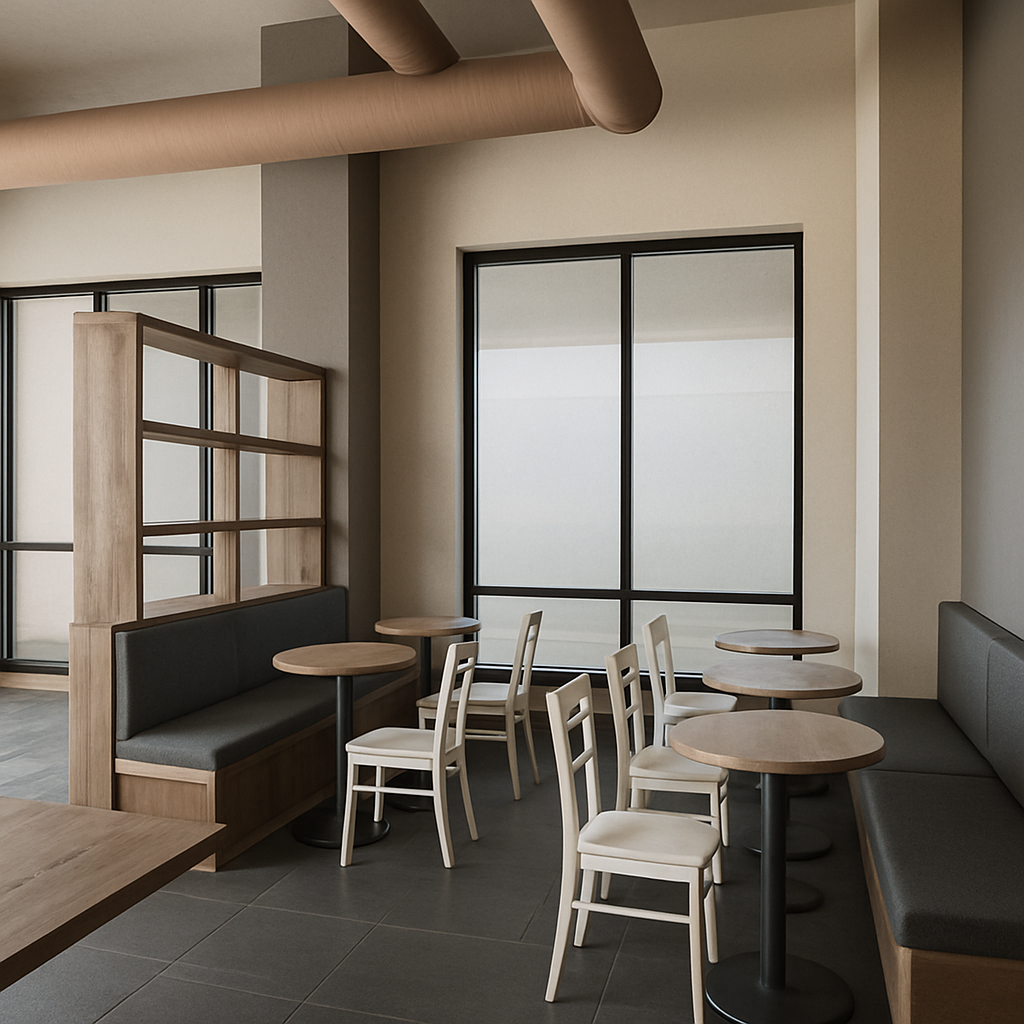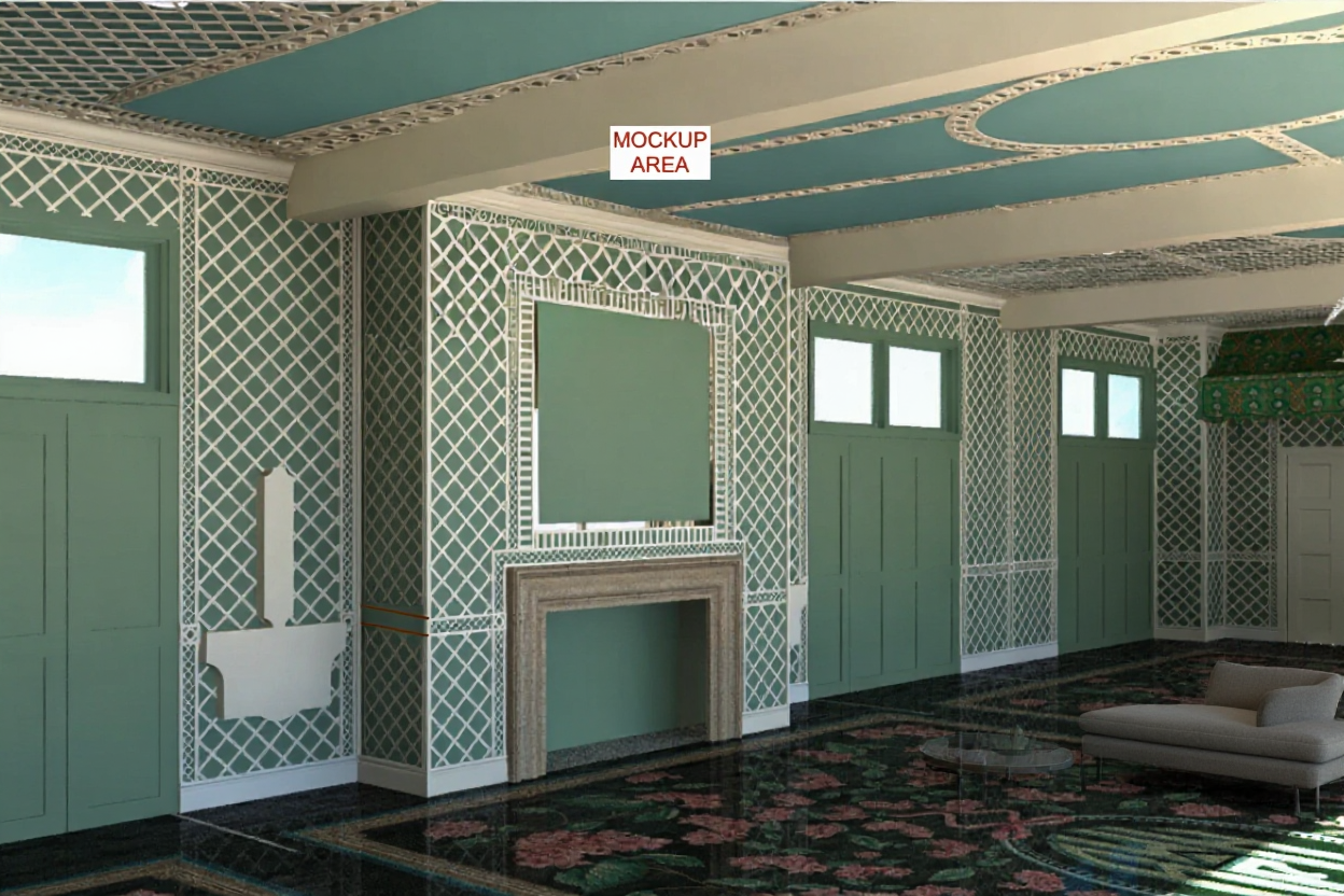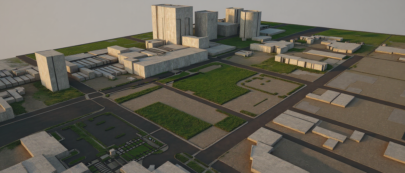 make this a photorealistic rendering make the building on the right a hotel with a hotel sign made out of red neon lettering supported by a thin metal frame above the parapet make landscaping against the buildings make the parking surface resemble elegant pavers