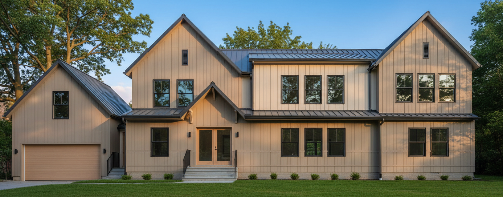 change the color of the house to specifically forged steel on the stucco body urbane bronze on the lap siding and trim and garage door and corbels use forever green all paint colors from sherwin williams
