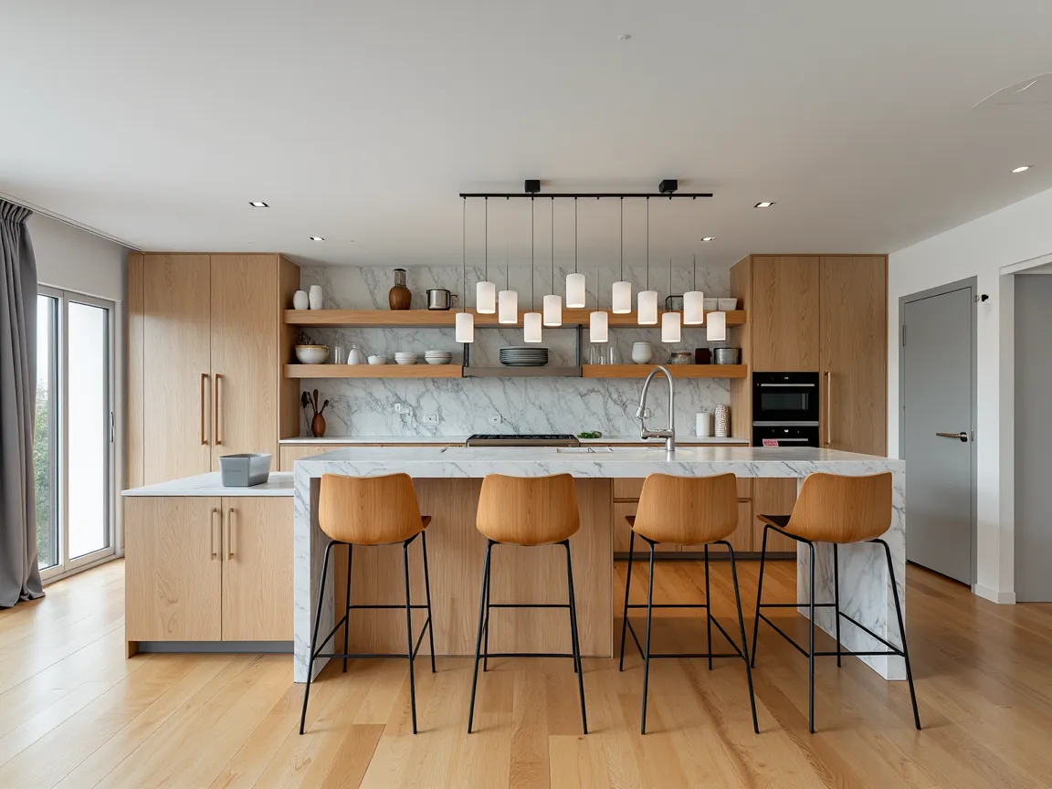 exterior shot white rift cut oak cabinets brush nickel hardware taj mahal quartz countertops and backsplash on all exposed walls the hood above the stove is actually contained in a fluted square tile the floors are beige render it with that exact layout of the image i posted also add white ceilings with recessed lighting and square picture frame molding in a creamy white