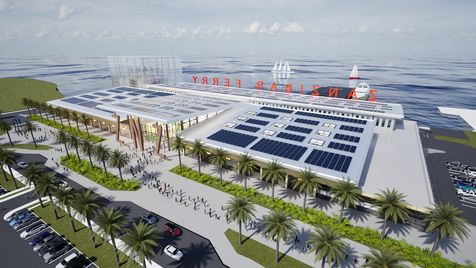 the image depicts a modern ferry terminal with a large building featuring solar panels on its roof the facility is surrounded by palm trees and has a parking area with several cars with the ocean visible in the background and has the word zanzibar ferry written in beg red letter