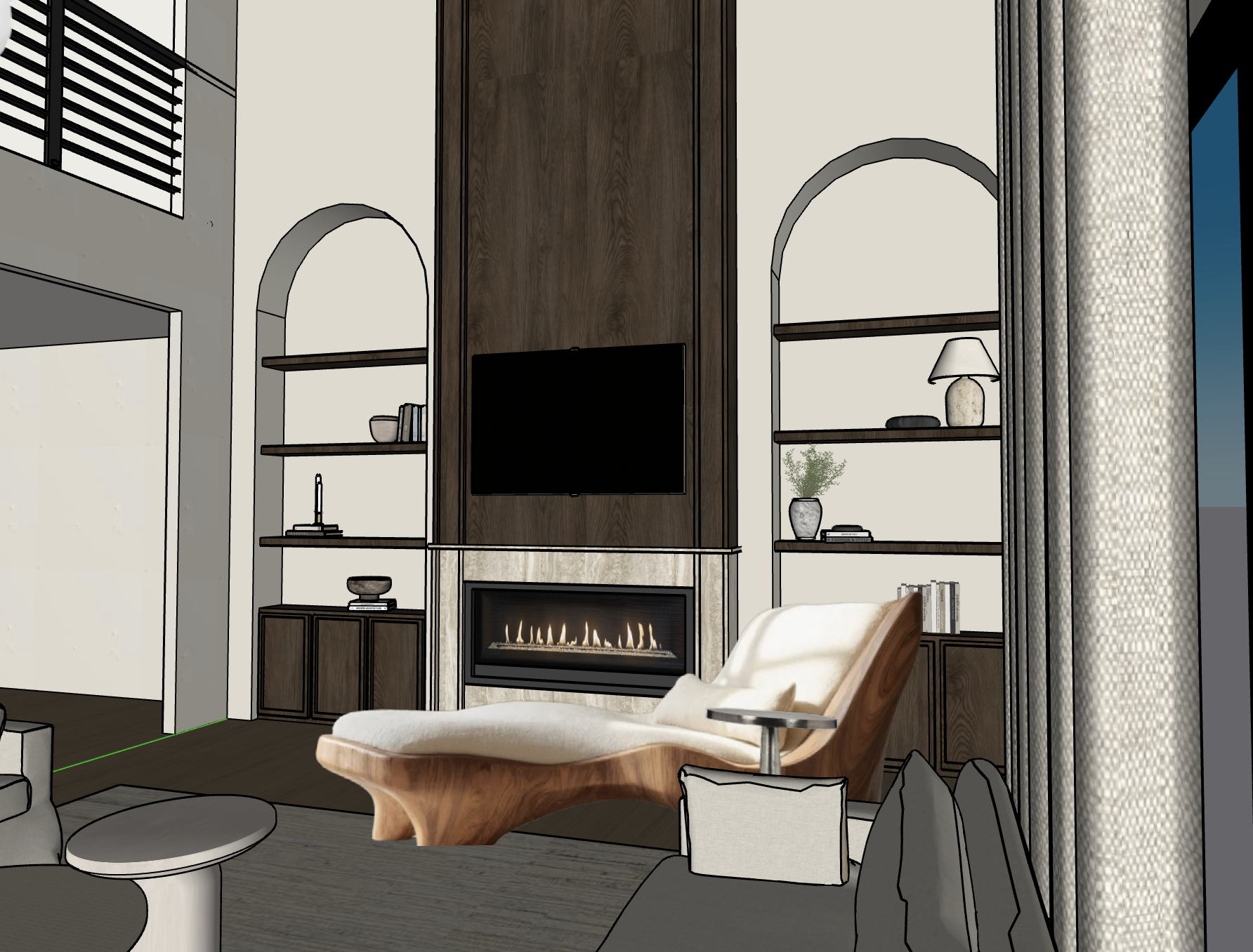 render a luxurious modern living room with a calm and inviting atmosphere use a soft beige color for the walls to create warmth incorporate rich dark wood for the shelving and fireplace frame adding elegance to the space the lounge chair should be a smooth polished wood with soft white cushions providing comfort and style add a sleek black tv above the fireplace and ensure the fire glows warmly casting a cozy light use light gray and cream tones for the curtains and pillows enhancing the tranquil setting the side tables should have a smooth off white marble appearance to complement the design