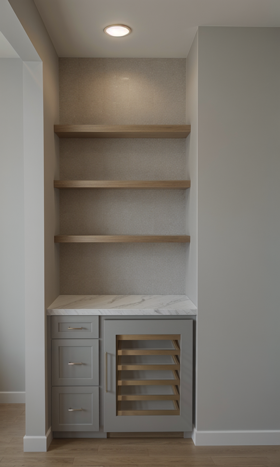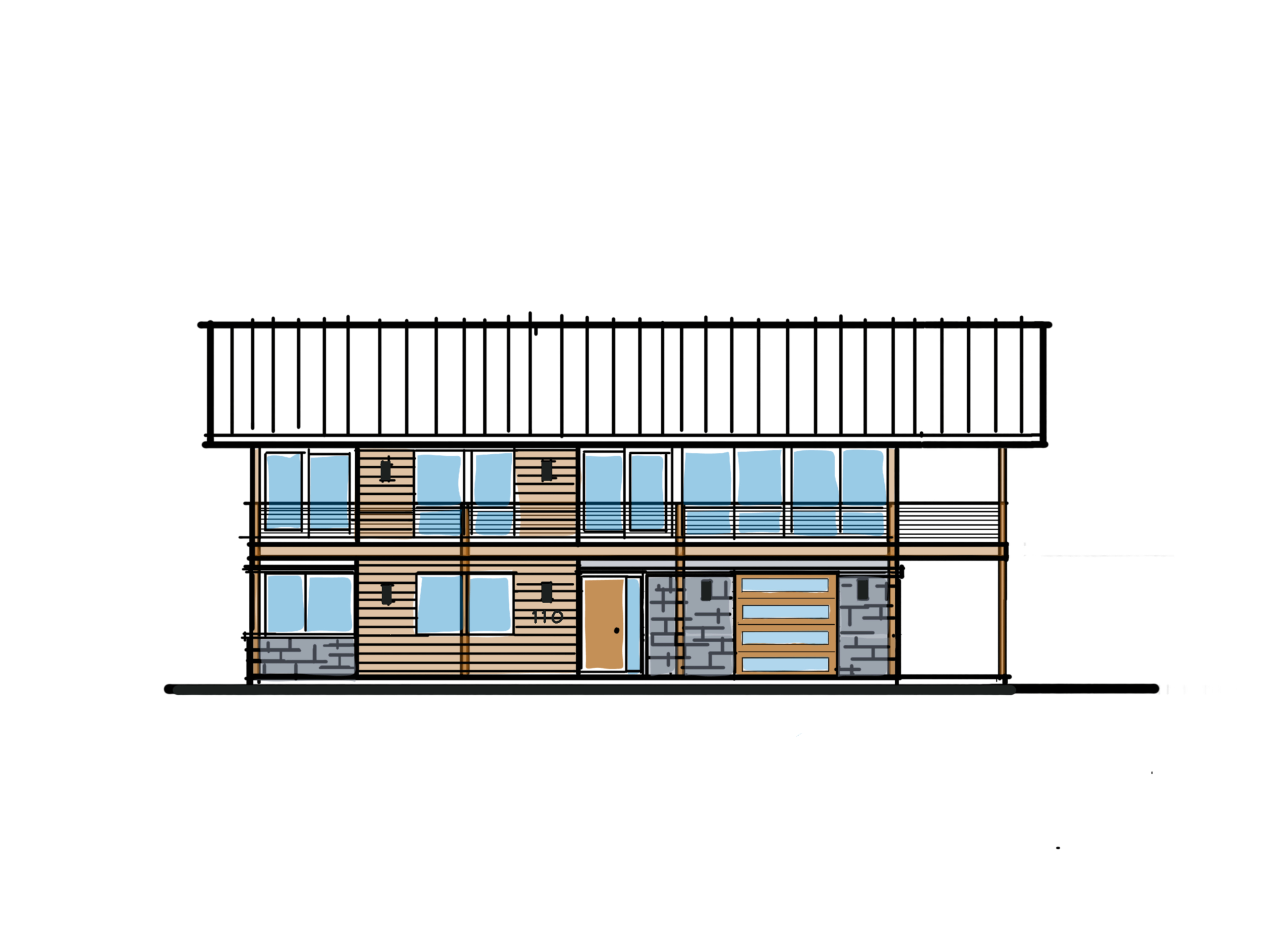 modern house with a covered side porch and low sloped metal roof surround the house with modern zen landscaping and trees warm sunny sky reflecting in the windows