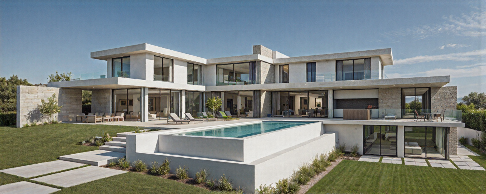 pool instruction keep the existing pool shape and position exactly as modeled but render it as an infinity edge pool where water overflows cleanly on one side and cascades softly to the second lower level below no change to pool footprint or walls only water behavior and edge treatment