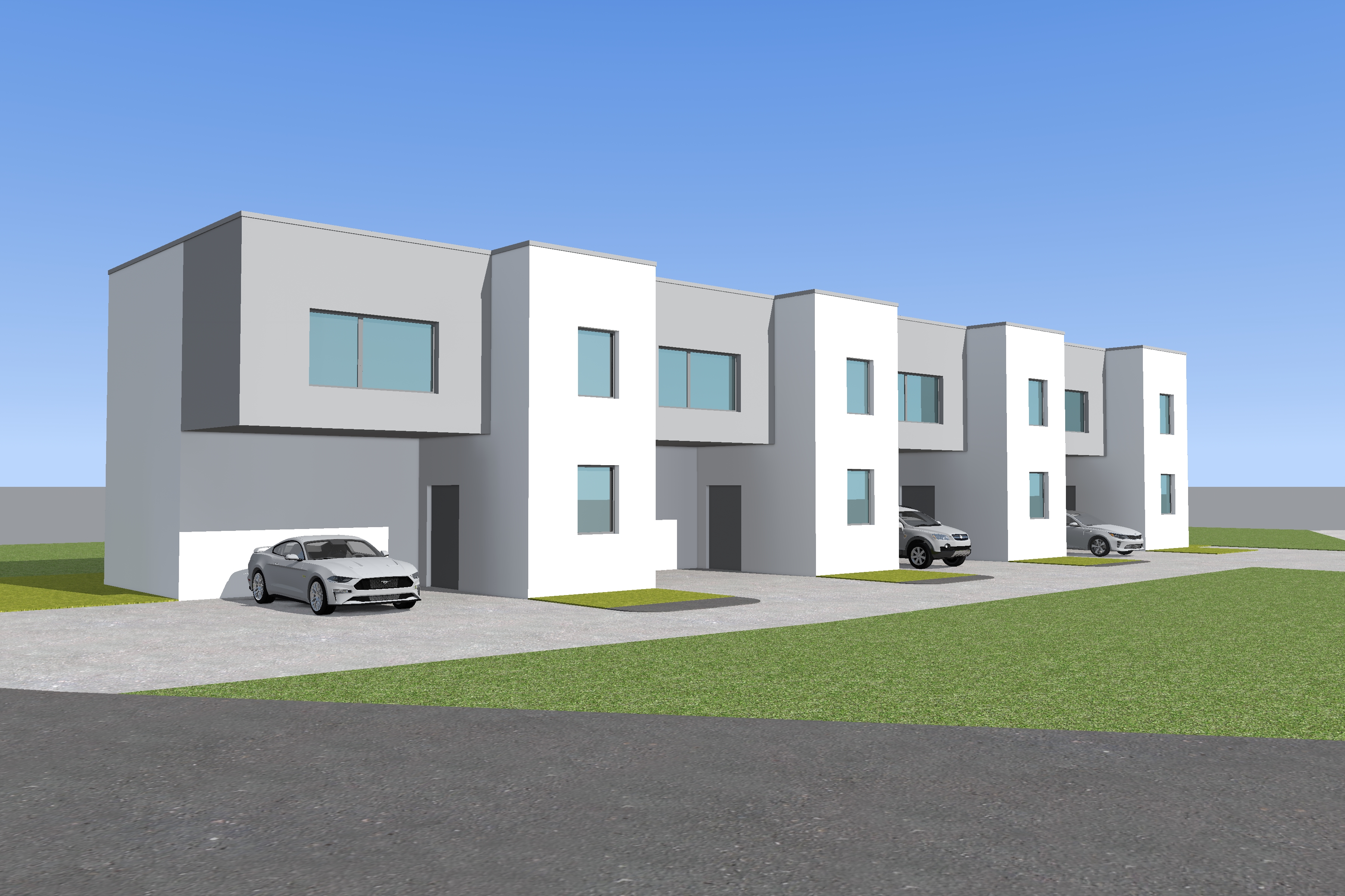 exterior shot summer vibe trees just at hte sides of building white cars sunny with clouds architecture