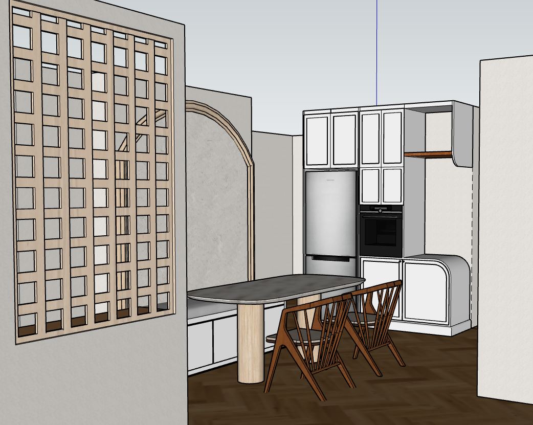 modernist interior shot transform this sketchup interior of an entryway leading into a kitchen dining area into a photorealistic wabi sabi japandi render strictly preserve the original camera angle spatial proportions and layout from the sketchup model design materials natural light oak ash wood lattice screen with soft matte finish smooth arched wall niche finished in limewash or clay plaster texture kitchen cabinetry in warm off white soft cream with thin black shadow gaps dark walnut or smoked oak accents on selected shelves and trims dining table with rounded organic edges and stone or concrete tabletop wooden dining chairs with natural timber tone and handcrafted feel flooring in warm dark oak parquet or timber flooring walls textures subtle limewash microcement walls with visible natural texture no flat pure white surfaces lighting mood soft warm lighting 2700k 3000k gentle daylight entering from side diffused and calm soft shadows realistic global illumination no harsh highlights no over brightness styling minimal japanese inspired decor handcrafted ceramic pieces linen textures natural elements clean calm lived in atmosphere render quality ultra realistic materials and textures natural reflections and shadows editorial interior photography look warm color grading soft contrast overall mood serene grounded cosy timeless wabi sabi home with japandi influence architecture