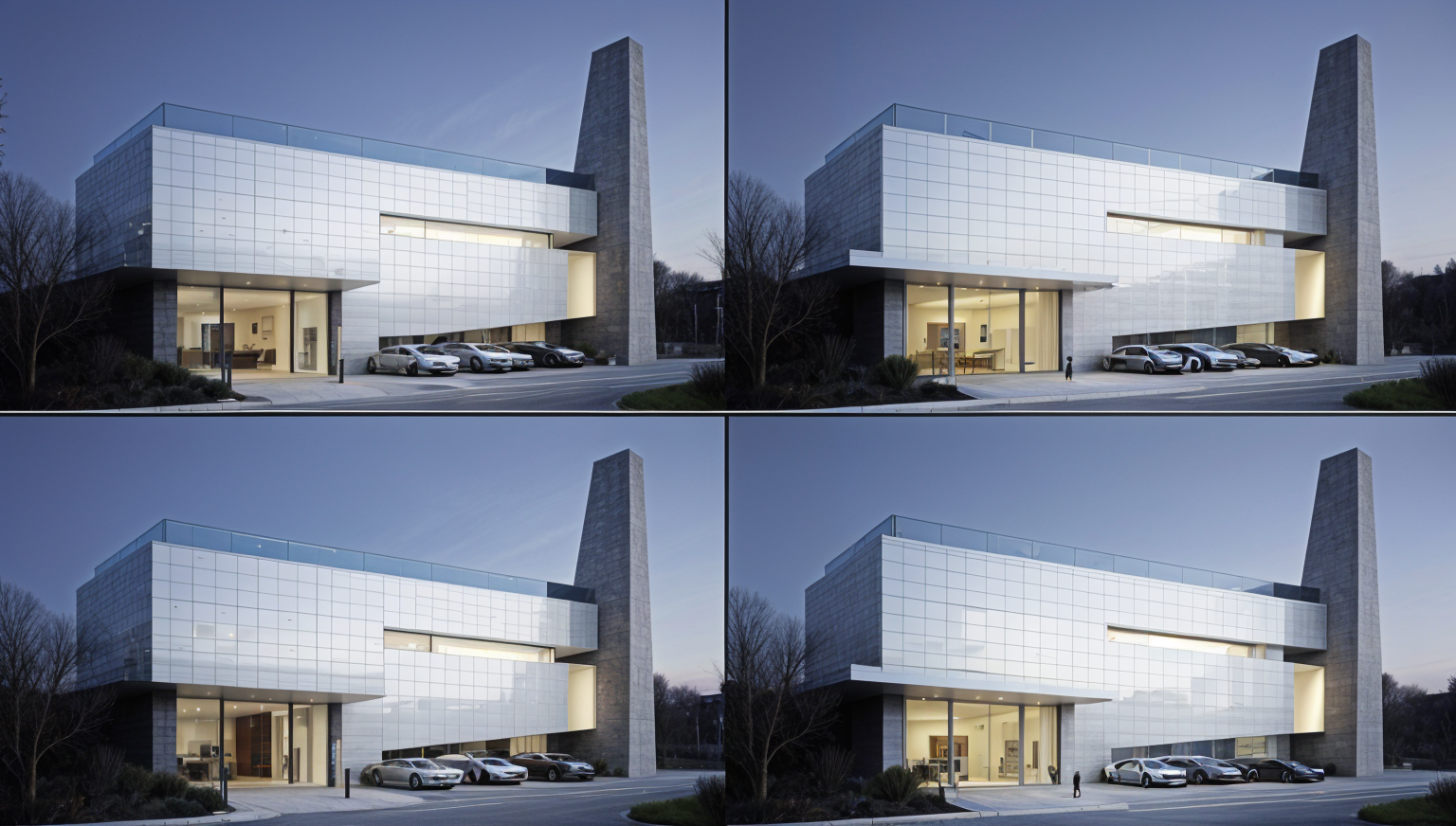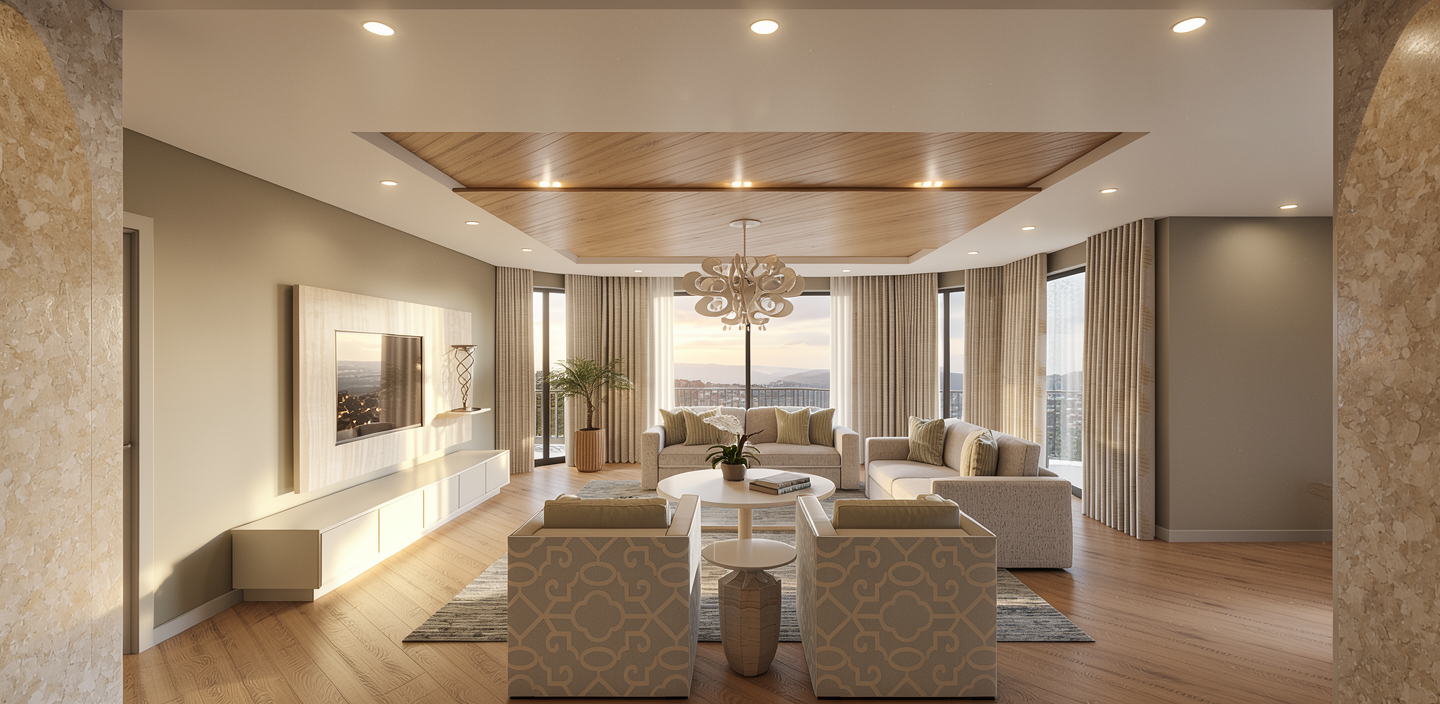photorealistic render strictly based on the provided reference image of a tradeshow booth all geometry needs to remain exactly as shown match geometry proportions layout and design exactly as shown do not add remove or reinterpret any elements open corner booth structure with flat roof and exposed vertical and horizontal beams in medium beige natural wood wood has a matte finish and subtle grain no color shift all cabinetry and ceilings in very dark red brown color ncs s 8010 y90r matte finish uniform tone cabinet doors are recessed panel style dark finish no added detailing cabinets doors that are see through on back wall have glass centers and the interiors of those cabinets are softly lit lighting replicated from the model pendant lights positioned exactly as shown neutral soft warm white light no dramatic lighting effects camera angle perspective and framing match the reference image as closely as possible background kept minimal and neutral no branding emphasis no stylistic enhancement render style moody realistic accurate material translation even lighting architectural feel