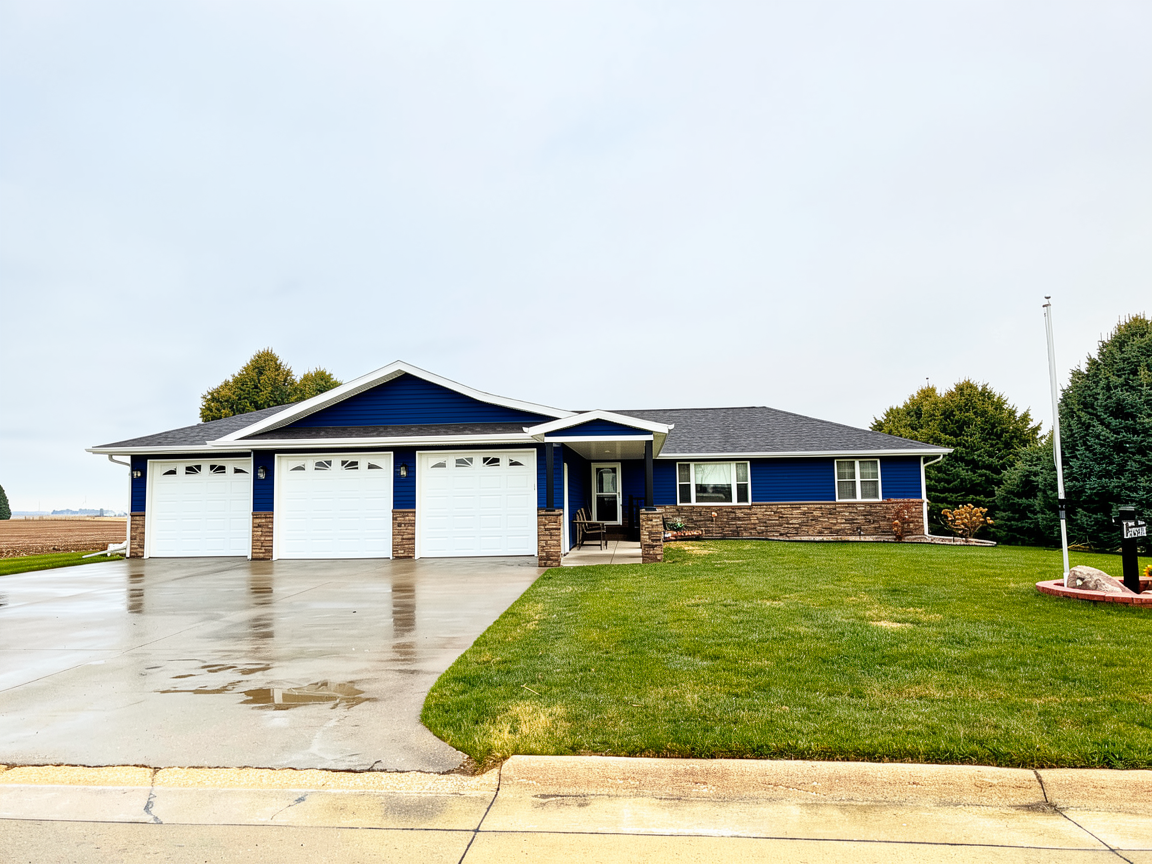 change siding color to cascade blue and keep garage doors and windows white and keep posts black