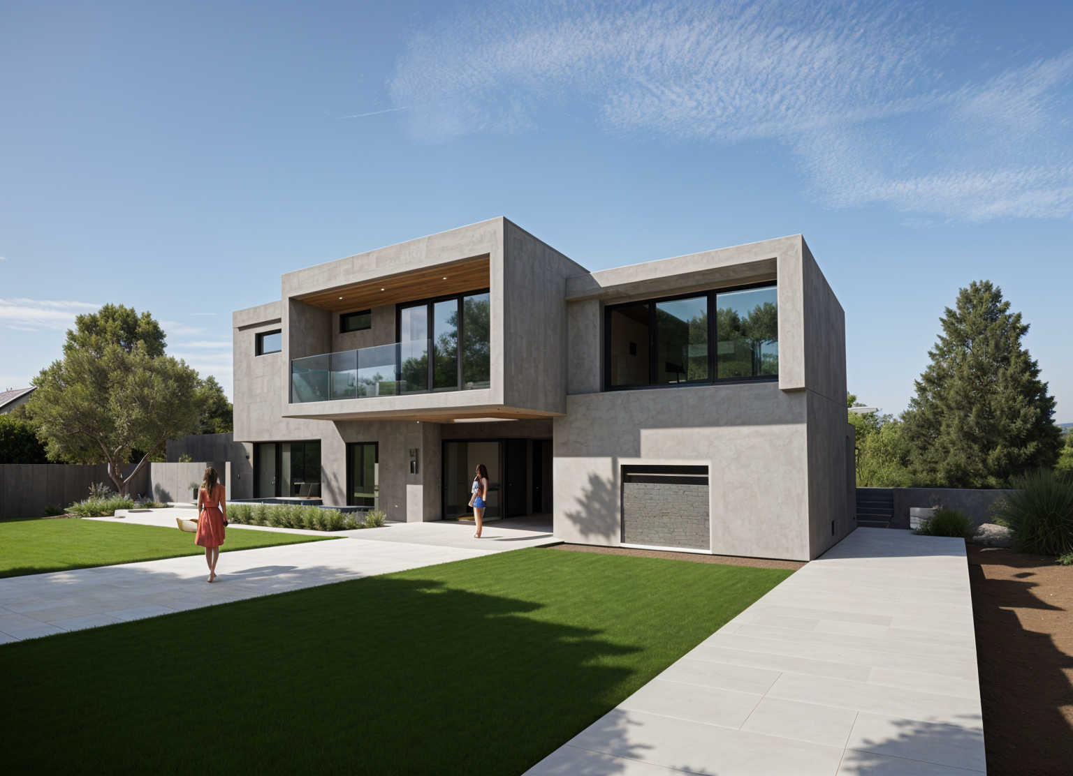 modernist exterior shot instead of water a green loan with beautiful arranged pavings architecture
