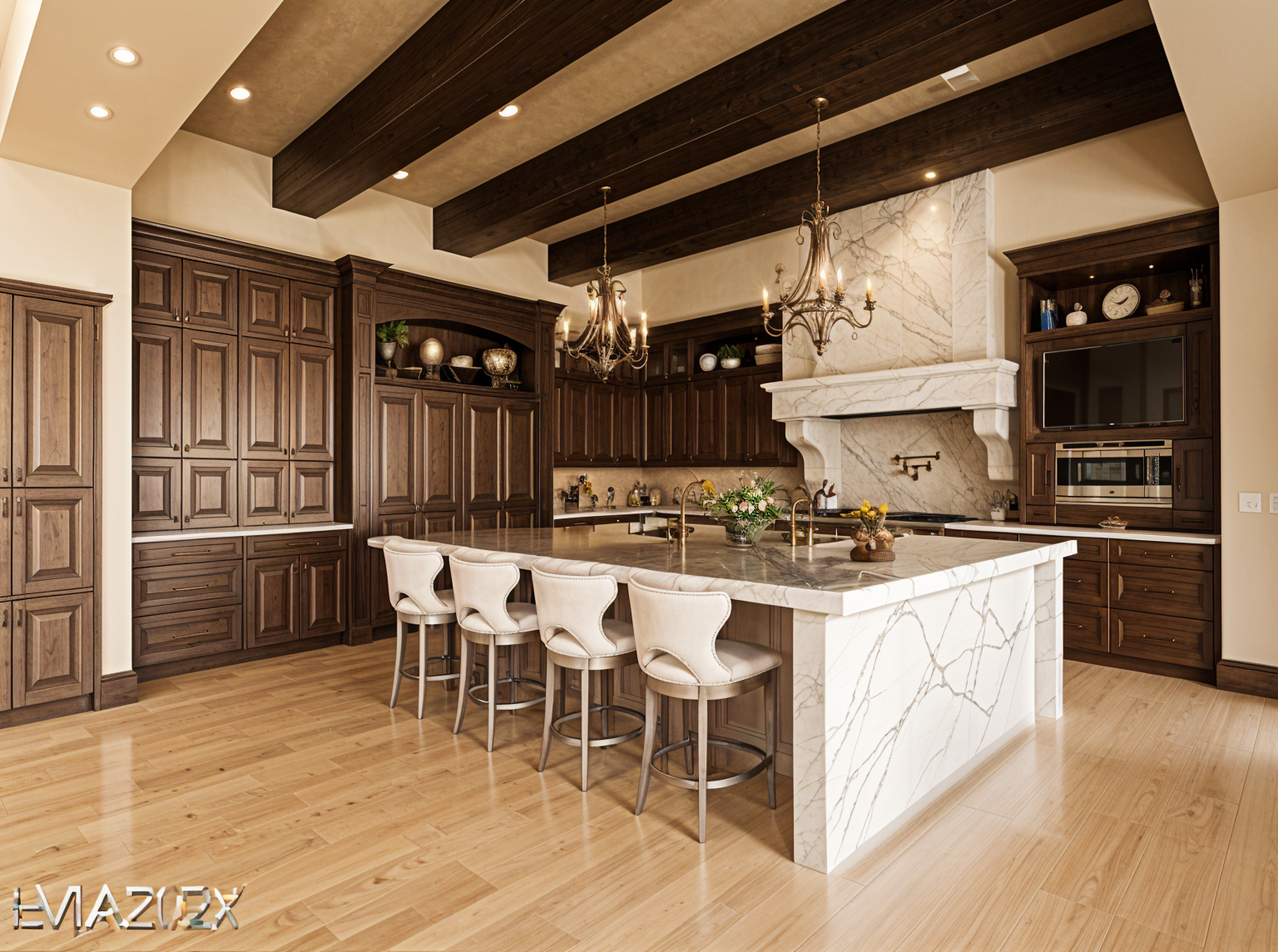 design me a wow factor that is more modern contemporary kitchen island with a waterfall edge design take out all of the ornate pieces the sides of the kitchen island to be a nice waterfall edge made of natural stone that is a cream beige color with nice veining also design me the hood vent to be more modern with the same matching natural stone as the kitchen island make the hood vent more straight and squared