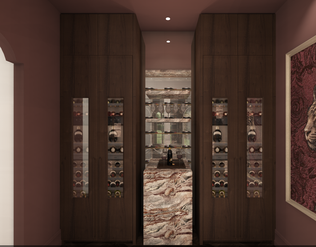 convert this image into an ultra photorealistic render critical preserve the original image exactly do not change composition camera angle proportions or layout do not add remove or redesign any elements do not restyle the space color atmosphere lock strict keep all colors exactly as in the original image the dark purple wall finish must remain identical in hue saturation and brightness do not brighten the image do not apply color grading or tone changes do not make the scene lighter whiter warmer or cooler mood lock the space must remain very dark moody and intimate maintain the original contrast and shadows no artificial lighting boosts or exposure increases this is a high end wine room only enhance material realism subtle textures accurate reflections natural imperfections improve lighting realism without increasing brightness rendering goal photographic realism with physically accurate materials and lighting natural shadows realistic reflections and depth the result must look like a real photograph of the same space negative constraints no redesign no color shift no exposure increase no added light sources no style interpretation no artistic changes only improve realism nothing else
