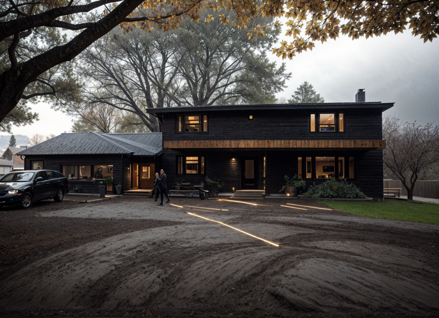 create a beautifully rendered modern bathroom from a top down perspective include a black granite vanity counter with undercounter lavatory sink with a satin silver faucet above the sinks hang a simple mirror with black border the walls should be 30x60cm gray cement finish tiles the shower wall in the right portion has a soap niche the floor is 20x20cm pattern tiles use light stone tiles for the floor to contrast with a plush gray bath mat incorporate a silver towel rack with beige towels and a woven basket beside the vanity ensure ambient lighting creates a tranquil and clean atmosphere highlighting the elegant and minimalist design