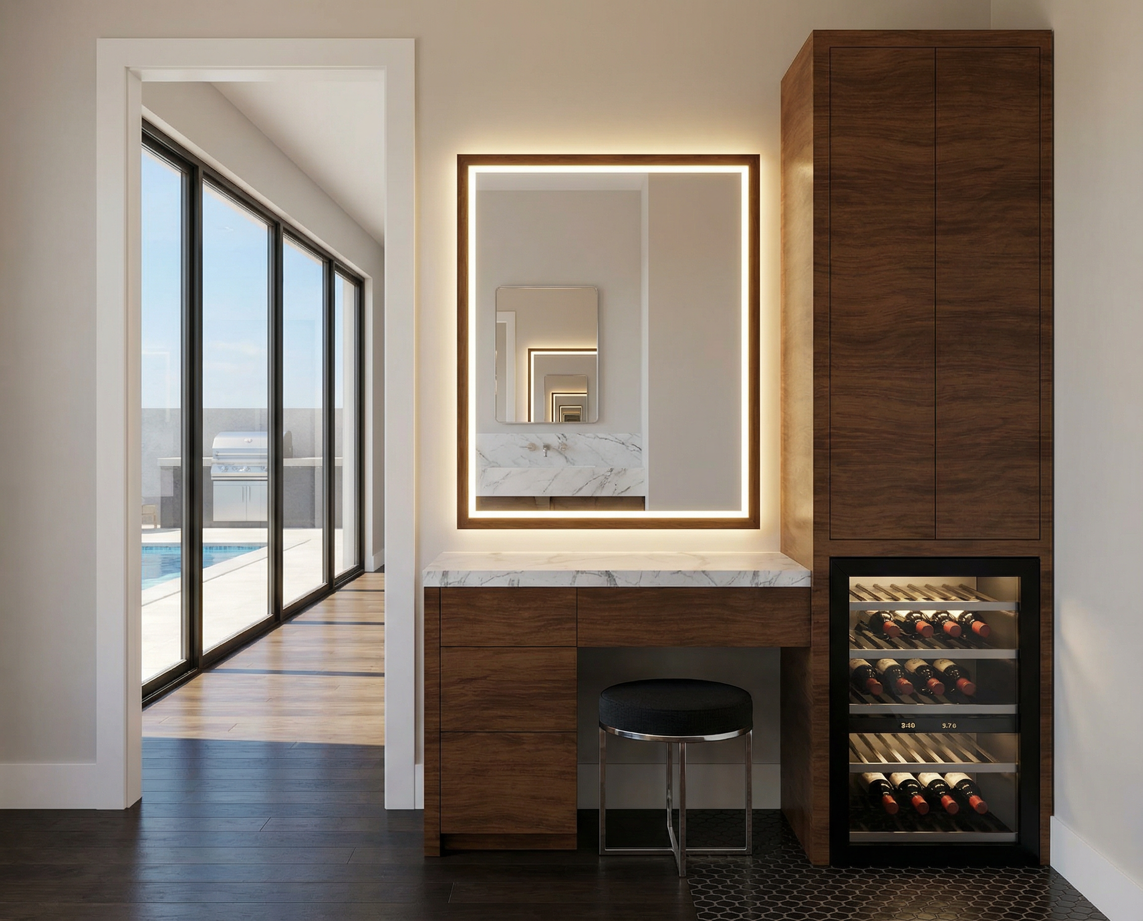 the mirror is glowing from behind with a soft led lighting and shower has a clear frameless glass connected to a crisp painted white wall the shower floor has a shinning copper penny tile the ceiling has recessed can lighting that perfectly illuminates the bathroom