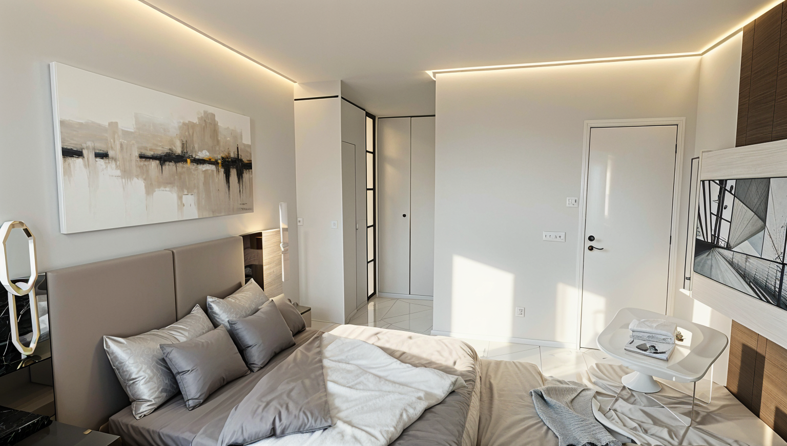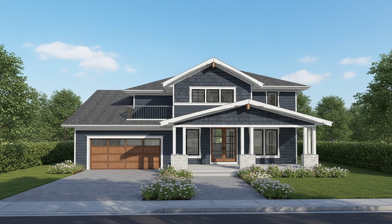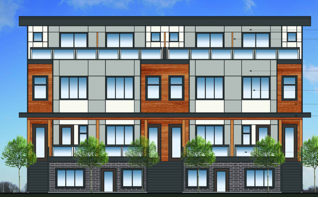 modern 4 storey townhouse development in a contemporary west coast style designed as a symmetrical multi unit residential building the fa ade features a balanced composition with alternating vertical sections of warm horizontal wood cladding cedar tone and smooth grey fiber cement panels the upper level includes recessed balconies with clear glass railings and dark metal frames creating a clean linear appearance large vertically proportioned black framed windows are evenly distributed across all levels maximizing natural light and reinforcing a modern grid aesthetic the ground level includes individual unit entrances with small covered porches supported by simple square columns the base of the building is finished with dark brick or stone veneer adding visual weight and contrast a continuous flat roofline with a slight overhang caps the building featuring minimalist fascia detailing in a dark charcoal tone the overall color palette consists of warm wood light and medium greys black accents and dark masonry at the base include subtle landscaping in front small evenly spaced ornamental trees and low greenery along the walkway set in an urban residential context similar to vancouver with soft natural daylight slightly overcast sky and realistic shadows