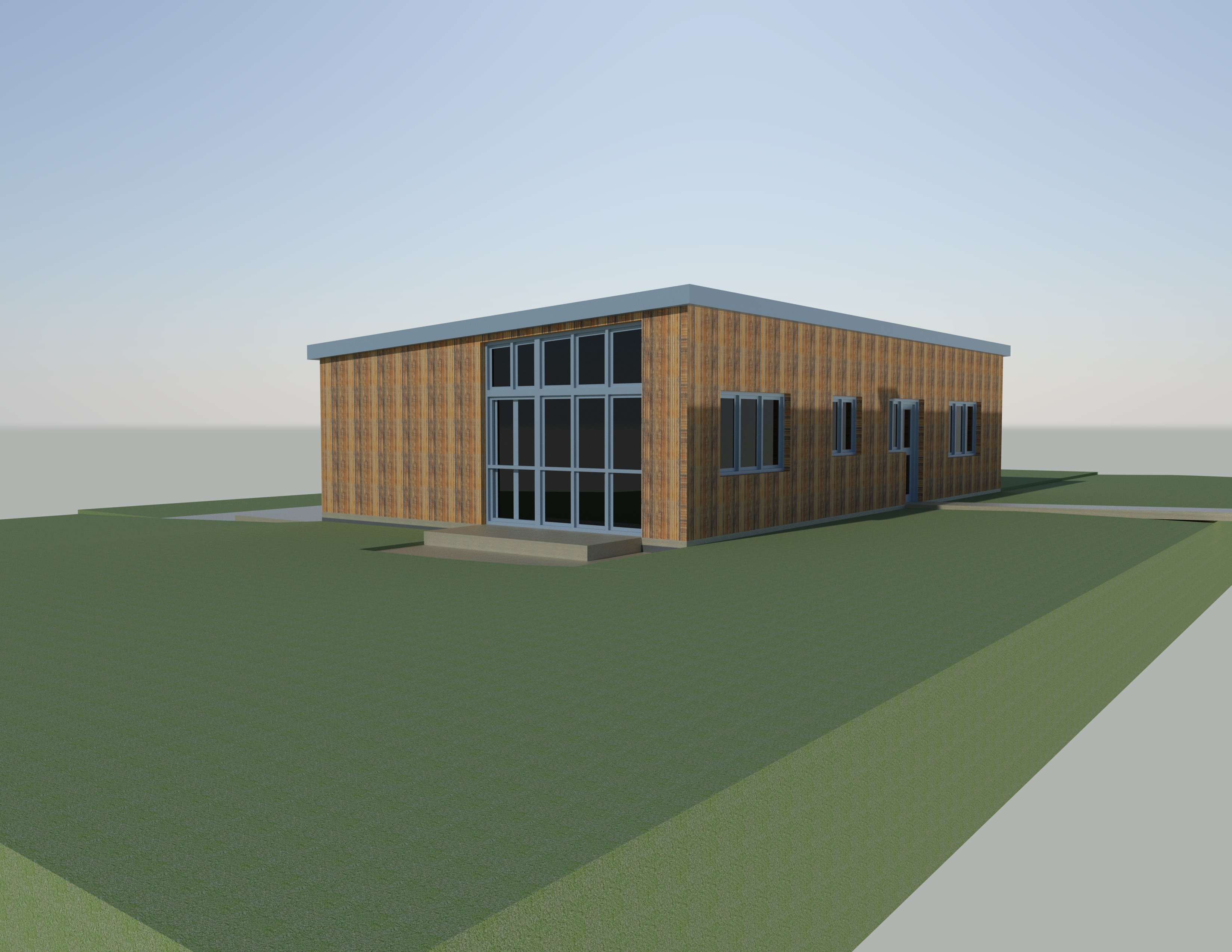 driveway with range rover parked at the end of the footpath walls vertically clad with cedar in a field setting with a hedged boundary sunny spring day